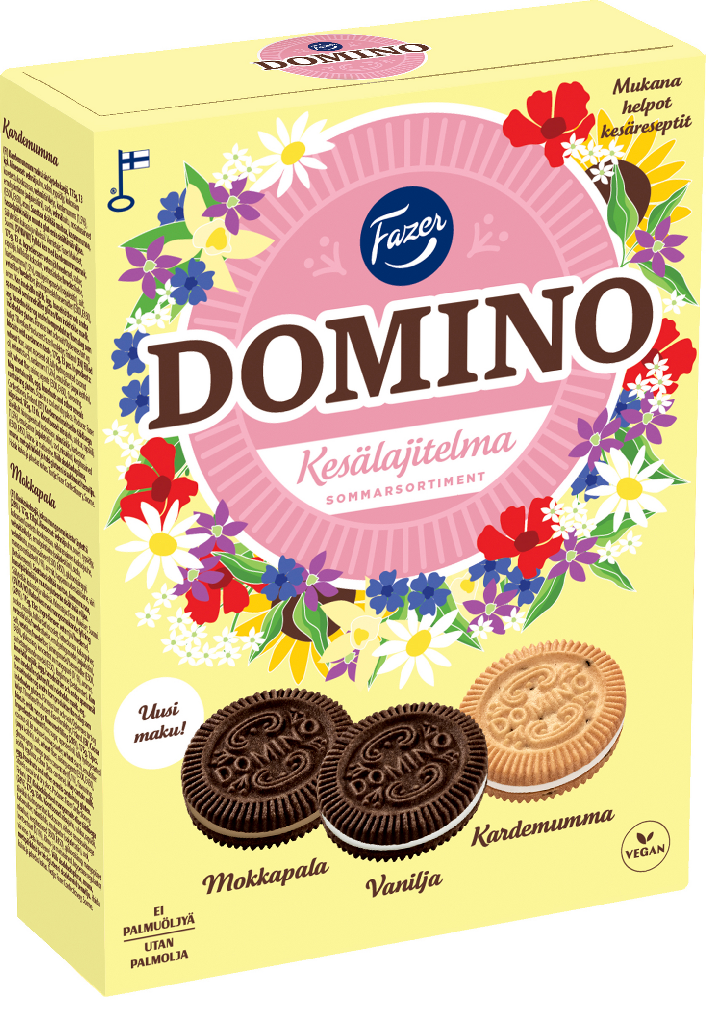 Herkullisessa Domino Keälajitelmassa maistuu täyteläiset vanilja, kardemumma ja mokkapala. Keksit leivotaan ilman palmuöljyä. Domino Kesälajitelma on maistuva tuliainen ja kesän juhlien herkku. Sopii vegaaneille.