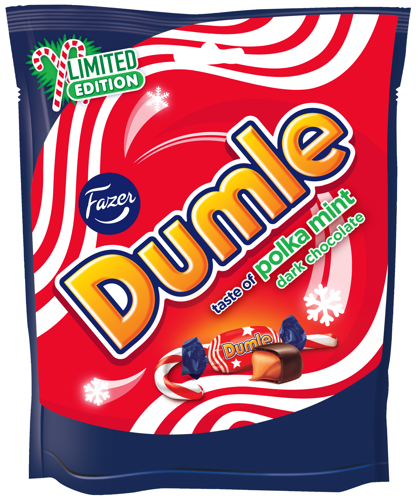 Maitosuklaalla kuorrutettu toffeekaramelli Dumle on maistuvan riemukas seuralainen, joka saa aina hyvälle tuulelle. Piparmintun makuista pehmeää toffeeta ja suussa sulavaa tummaa suklaata – Dumle Polka mint -karkit ovat joulun hauskin makuyllätys! Mikä parasta, kaikki Fazerin herkulliset suklaat on valmistettu 100 % vastuullisesti tuotetusta kaakaosta. Pussista riittää joulufiilistä jaettavaksi kavereillekin.