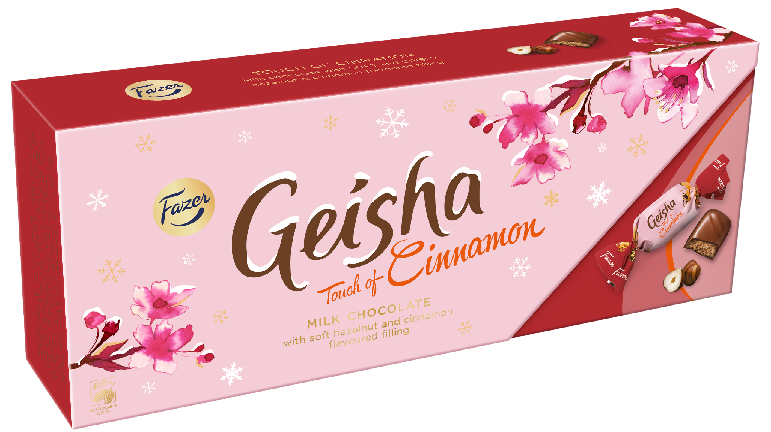 Geishan pehmeä maitosuklaa kätkee sisäänsä kanelin makuisen hasselpähkinänougat-täytteen. Herkullisten Geisha-konvehtien maitosuklaakuoren sisällä odottaa pehmeän rapea täyte. Mikä parasta, kaikki Fazerin herkulliset suklaat on valmistettu 100 % vastuullisesti tuotetusta kaakaosta. Inspiroidu rauhasta ja tarjoa ystäville hetki yhteistä aikaa. Kaunis rasia on myös lahja, joka muistetaan.