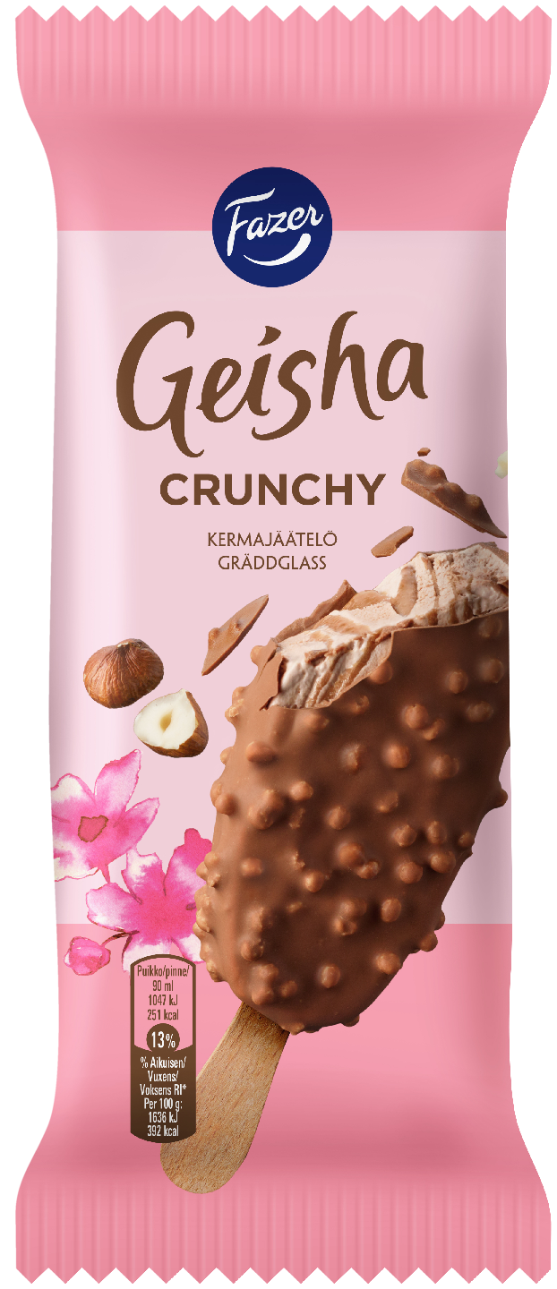 Fazer Geisha Crunchy nyt jäätelöpuikkona. Herkullista suklaakermajäätelöä hasselpähkinäkastikkeella aivan kuten makeishyllyn valloittaneessa patukassa. Kokonaisuus täydentyy maitosuklaakuorrutteessa olevilla rapeilla ja suolaisilla vehnämuroilla. Fazer-jäätelöt - Maut, joita jo rakastat. Fazer-jäätelöiden tuoteperhe koostuu suosituista Fazerin makeisbrändeistä. Fazer-jäätelöt valmistetaan suomalaisesta kermasta, Turengin jäätelötehtaalla.