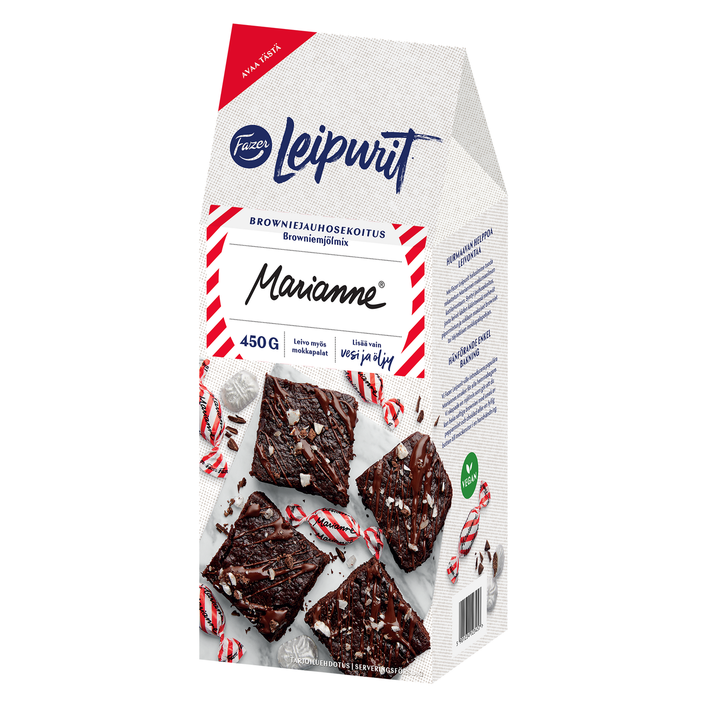 HURMAAVAN HELPPOA LEIVONTAA! Me Fazer Leipurit halusimme tuoda rakastetun Mariannen makumaailman kotileivontaan. Syntyi jauhosekoitus, josta leivot käden käänteessä mehevät piparmintun ja suklaan makuiset browniet tai täyteläisen mokkapalapohjan.