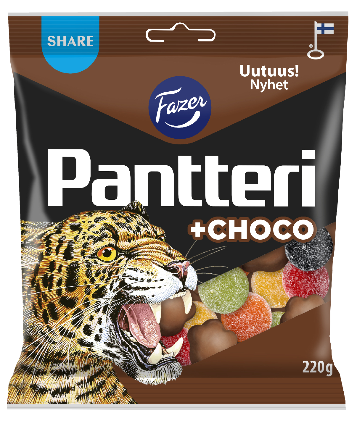 Pantteri on makeansuolainen salmiakki, joka tuo kissaeläimen vaistosi esiin. Uusi Pantteri +choco karkkipussi on petomaisen herkullinen yhdistelmä täysin uusia suklaisia tassuja ja tuttuja klassikoita, hedelmäisiä Pantteri-karkkeja ja pehmeitä Musta Pantteri -salmiakkeja. Syötävän suloisten tassujen suklaanmakuinen kuori kätkee sisäänsä salmiakkia. Tämä kissamainen uutuuspussi vie kielesi, olitpa sitten Pantterin tai suklaisten karkkien ystävä!
