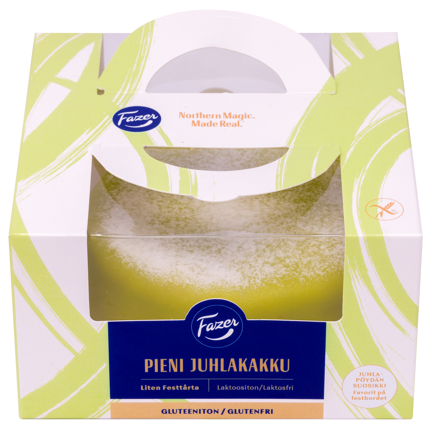 Fazer Pieni Juhlakakku Gluteeniton valloittaa herkullisella makuyhdistelmällään. Suloisen kakun marsipaanikuorrutus sekä raikas täyte vadelmahillosta ja aidosta kermasta ovat täydellinen makupari. Fazer Pieni Juhlakakku on monen juhlapöydän suosikki, sillä se on laktoositon ja gluteeniton.