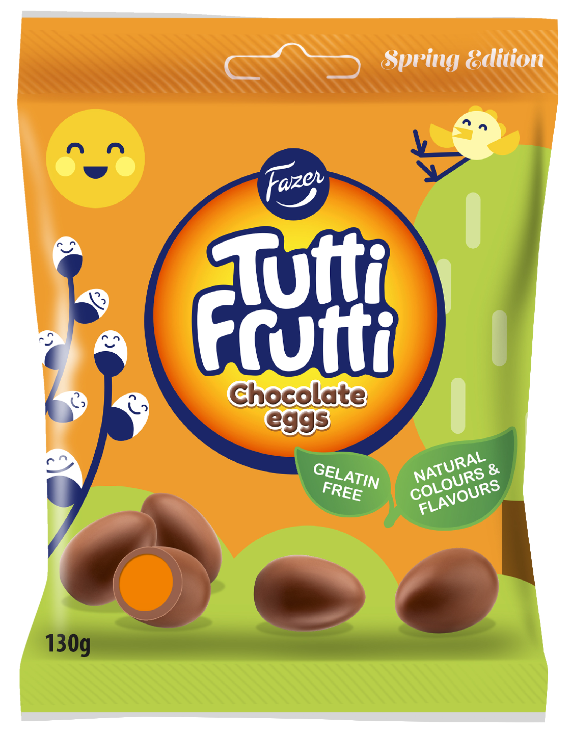 Hedelmäinen Tutti Frutti tuo iloa ja aurinkoa kaikille. Tutti Frutti Chocolate eggs on pääsiäisen iloisin pussi täynnä suklaamunia ihanalla hedelmäisen pehmeällä Tutti Frutin-makuisella täytteellä. Luontaisilla väreillä valmistetut Tutti Frutti suklaamunat ovat gelatiinittomia. Raikkaan makunsa ne saavat luontaisista aromeista. Ilahduta ystäviäsi hedelmäisellä pikkupussilla tai koristele pääsiäisherkut suloisilla suklaamunilla!