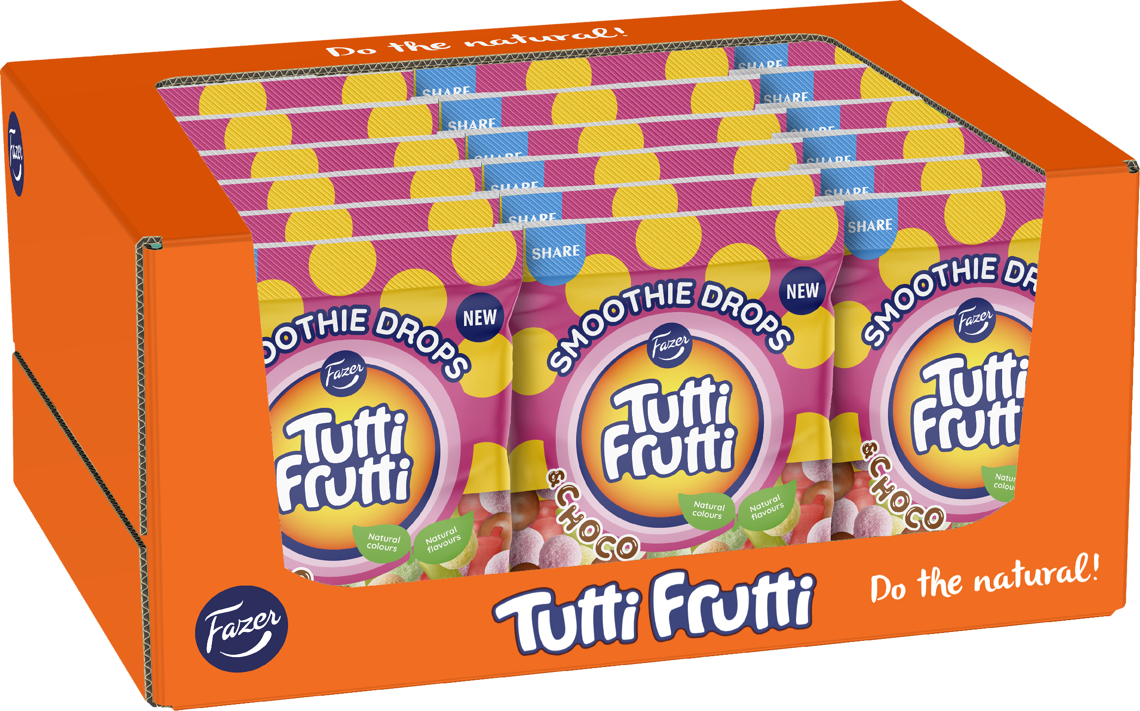 Tutti Frutti X Smoothie – täydellinen makuyhdistelmä!Tutti Frutti Smoothie Drops -pussi on täynnä ihanan hedelmäisiä, vaahtomaisia karkkeja, jotka tuovat mieleen suosikkismoothiet.Nauti uudesta kevyestä koostumuksesta neljässä herkullisessa smoothiemaussa:Vadelma-Sitruuna, Päärynä, Mango ja Mansikka-Banaani.Valmistettu luonnollisilla väreillä ja aromeilla – täysin palmuöljytön.Ihana pieni herkku juuri sinulle!