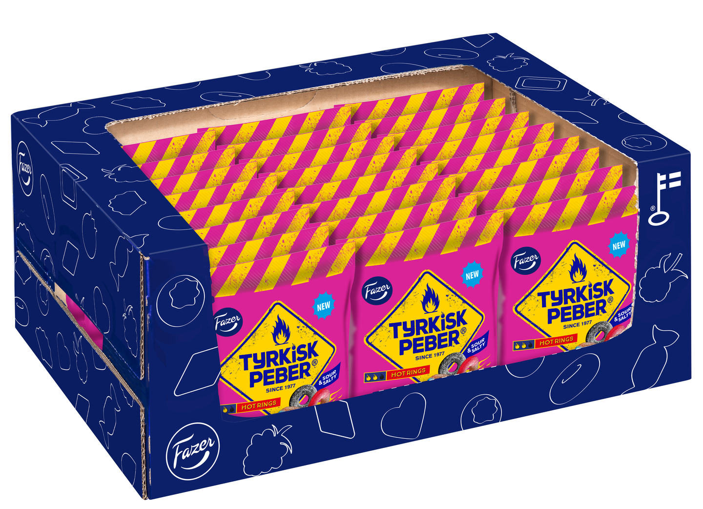 Tyrkisk Peber Hot Rings ei ole kuin mikä tahansa karkkipussi. Pussin kolme erilaista karkkia kutkuttavat makuhermojasi kirpeällä, salmiakkisella ja sopivan tulisella maullaan. Sekoitus sisältää kirpeitä hedelmä-lakritsin makuisia renkaita ja suolaisia salmiakkirenkaita – tutulla Tyrkisk Peberin ärhäkällä potkulla! Vegaaninen.