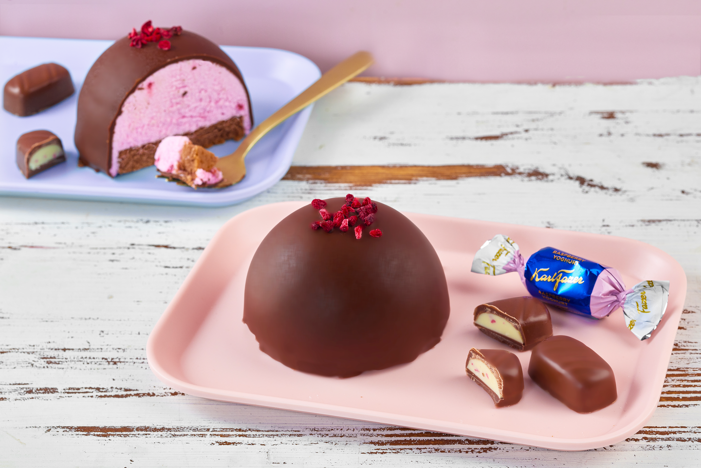 Raikas vadelmajogurttisuklaan makuinen mousseleivos. Tumma kakkupohja, vadelmajogurtin makuinen moussetäyte ja suussasulava kuorrute. Vietä nautinnollinen herkutteluhetki itseksesi tai yhdessä läheisten kanssa.