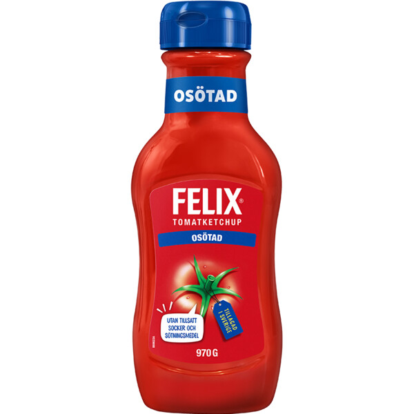 Tomatketchup utan tillsatt socker och sötningsmedel är en lite mindre söt ketchup men med samma goda ketchupsmak. Genom att balansera övriga ingredienser i ketchupen har vi lyckats få fram en lika god ketchupsmak men utan att tillsätta något socker eller sötningsmedel. (Endast 5,3 % sockerarter från tomaterna).\nNaturligtvis tillagad i Blekinge som alla Felix Tomatketchup och alltid utan konserveringsmedel.