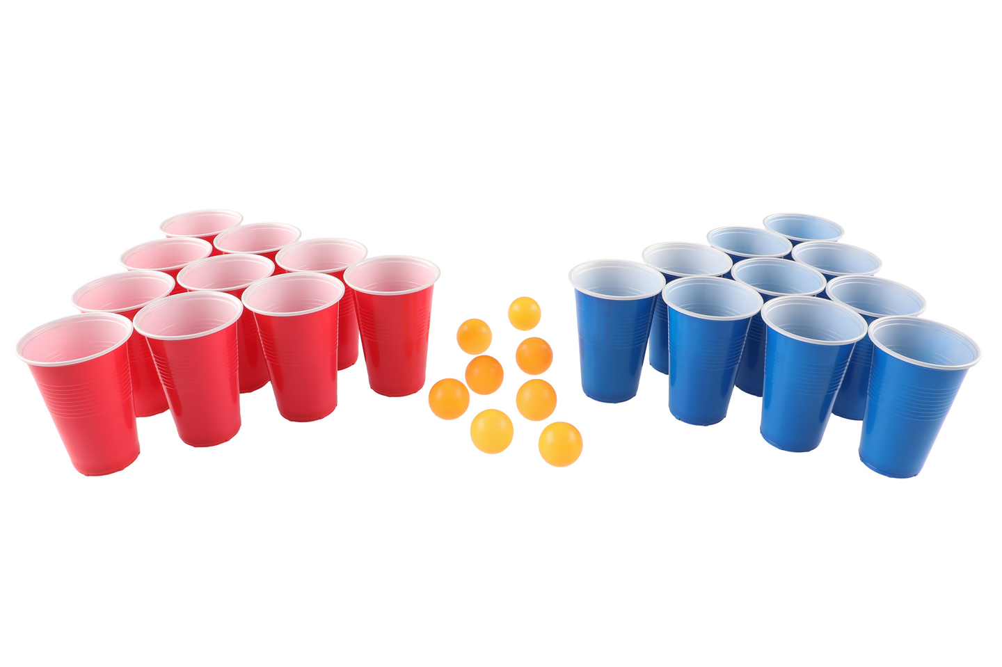Klassinen, elokuvista ja sarjoista tuttu juomapeli, jossa mukit asetetaan pöydälle kolmion muotoon, täytetään juomalla ja yritetään osua vastustajan mukeihin. Jos osuu mukiin, pitää vastustajan juoda muki tyhjäksi. Sisältää 24 kuppia 480 ml (12 kpl punaisia ja 12 kpl sinisiä) ja 8 palloa. 2+ pelaajaa. Materiaali: polypropeeni