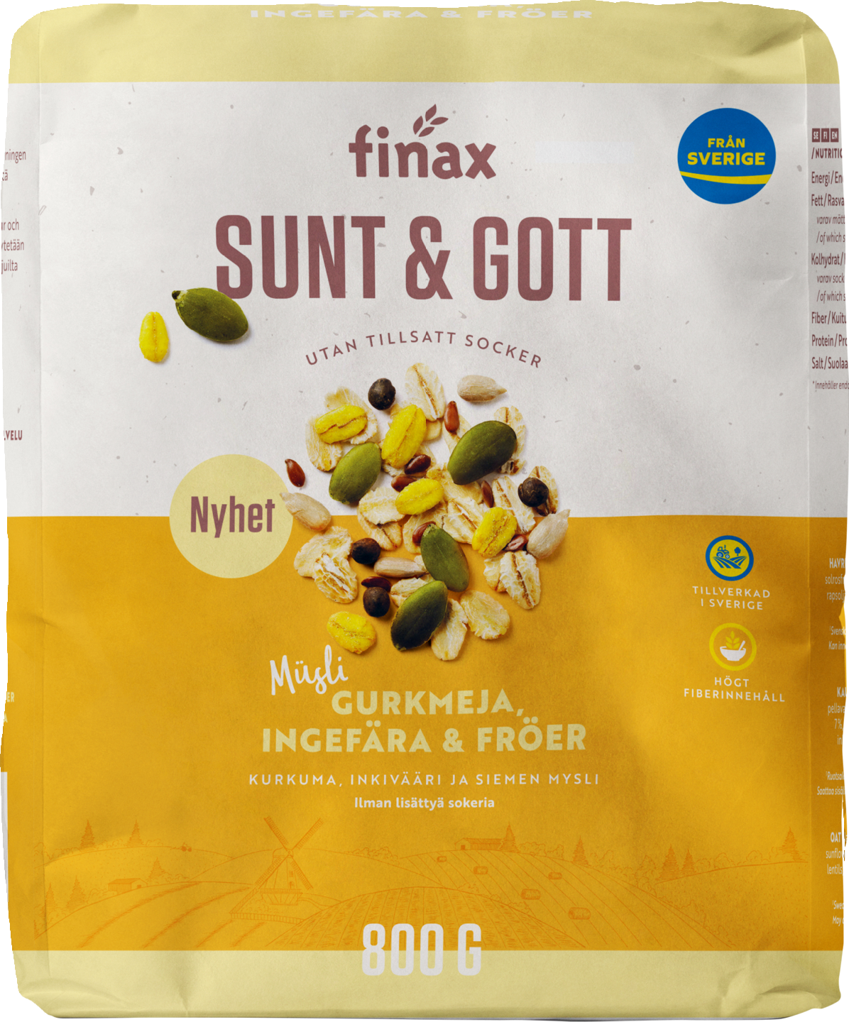 Tämä mausteinen mysli on varsinainen makupommi. Sisältää ihanan sekoituksen siemeniä ja ruotsalaista kauraa paahdettuna inkiväärin ja kurkuman kanssa. Mukana hippusen sitruunaa. Raikasta ja hyvää! Mukana vihreitä linssejä tuomassa lisäproteiinia.