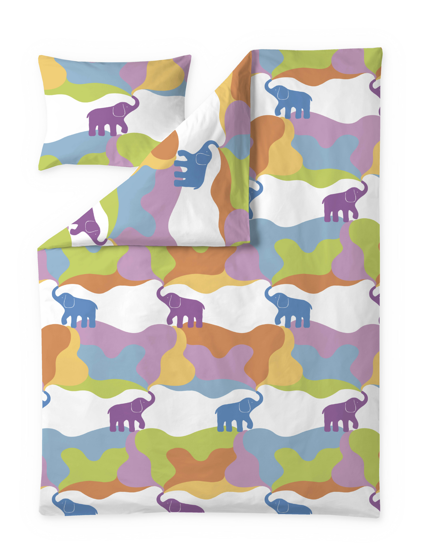 Elefantti Riemu -pussilakanasetissä on käytetty ainoastaan luomupuuvillaa.