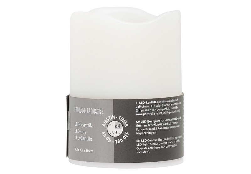 Muovinen LED-kynttilä. Lämmin valkoinen LED-valo. 6h On/18h Off- ajastintoiminto. Toimii kolmella AAA-paristolla (eivät sisälly).