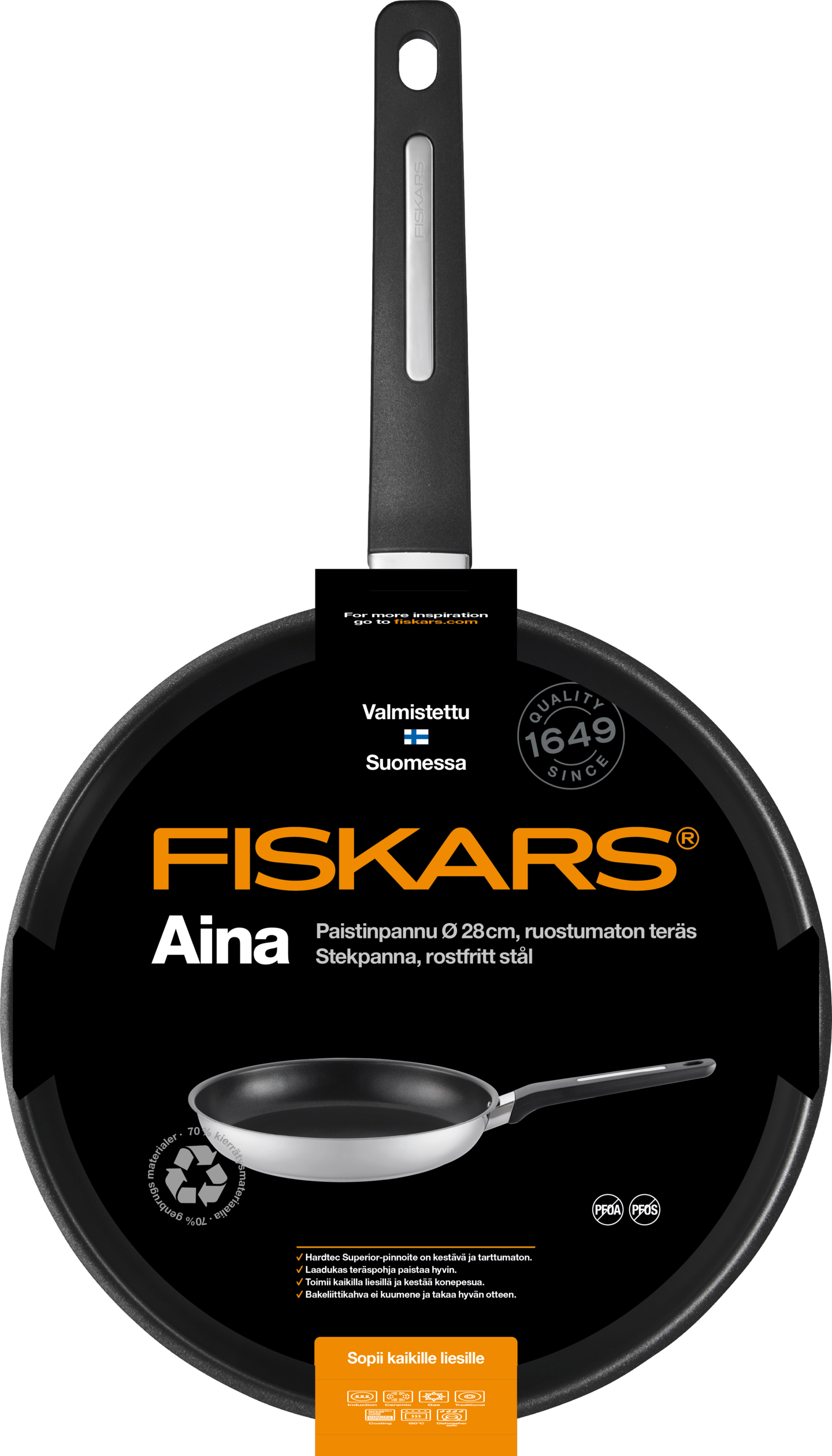 Fiskars Aina -ruostumaton teräs paistinpannu 28 cm on suunniteltu kestämään arjen kovaa käyttöä. Helppohoitoinen pannu on valmistettu korkealaatuisesta ruostumattomasta teräksestä ja sopii käytettäväksi kaikilla liesillä. Paistinpannun bakeliittikahva ei kuumene ja takaa hyvän otteen. Fiskars Aina -ruostumaton teräs paistinpannu 28 cm sopii täydellisesti jokapäiväiseen ruoanlaittoon kaikille liesille