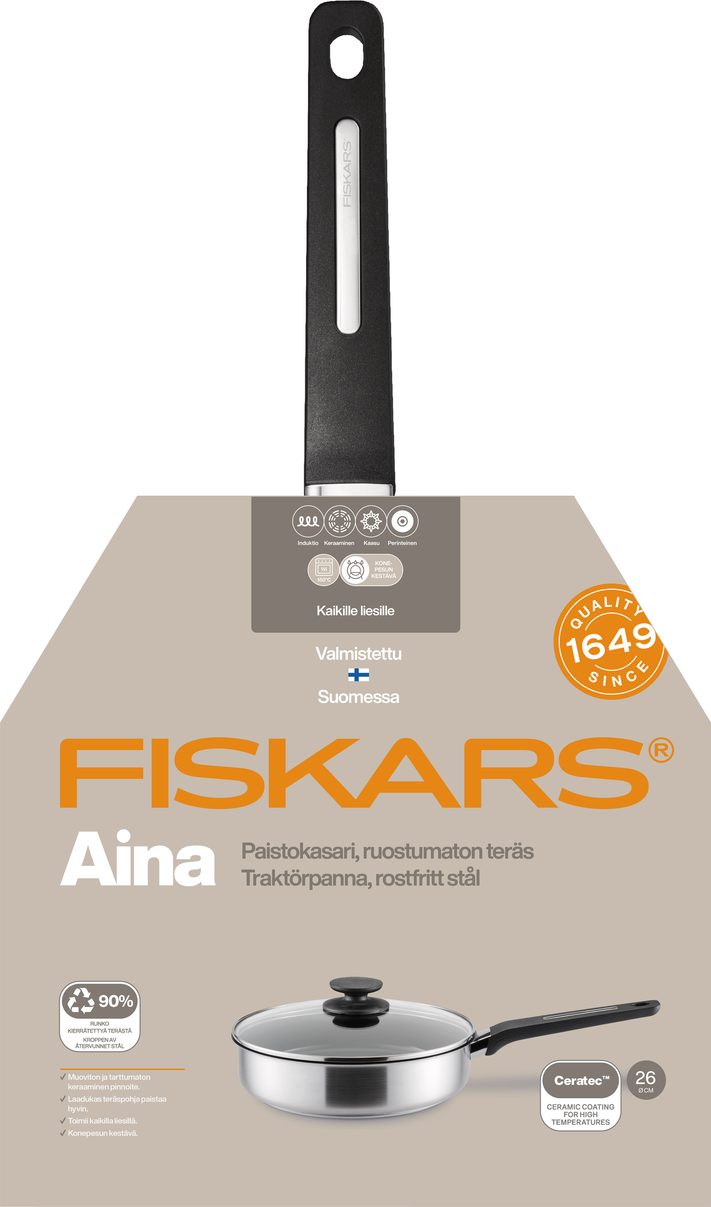 Fiskars Aina -keraaminen paistokasari 26cm on suunniteltu kestämään arjen kovaa käyttöä. Helppohoitoinen kasari on valmistettu korkealaatuisesta ruostumattomasta teräksestä ja sopii käytettäväksi kaikilla liesillä. Paistokasarin kahva ei kuumene ja takaa hyvän otteen. Fiskars Aina - paistokasari 26cm sopii täydellisesti jokapäiväiseen ruoanlaittoon kaikille liesille.