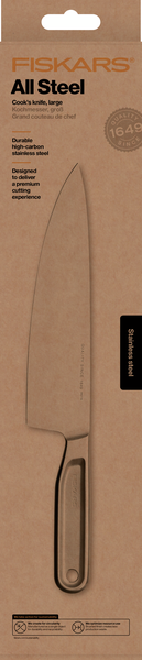 Fiskars All Steel -iso kokinveitsi (20 cm) on valmistettu korkealaatuisesta ruostumattomasta teräksestä. Suorituskyvyltään erinomainen keittiöveitsi on suunniteltu kestämään käyttöä ja aikaa. Erityisen vahva terä sopii kaikenlaisiin keittiön leikkuutöihin. Japanilainen hiiliteräs tekee veitsestä erittäin kestävän, ja sen saumaton, valettu rakenne on tyylikkään ajaton. Veitsen täydellisen tasapainon ansiosta leikkaaminen on luontevaa ja mukavaa. Suositellaan pestäväksi käsin. Suunniteltu Suomessa.