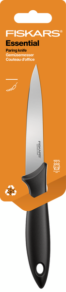 Fiskarsin Essential-veitsisarja tekee arjen ruuanlaitosta helppoa. Essential-vihannesveitsen terä on valmistettu japanilaisesta ruostumattomasta teräksestä, ja sen mustassa muovikahvassa on rosoinen viimeistely. Vihannesveitsi on pieni ja näppärä ja sopii erilaisten juuresten ja hedelmien kuorimiseen ja leikkaamiseen. Veitsen sileä leikkuuterä helpottaa työskentelyä entisestään. Konepesun kestävä. Suunniteltu Suomessa.
