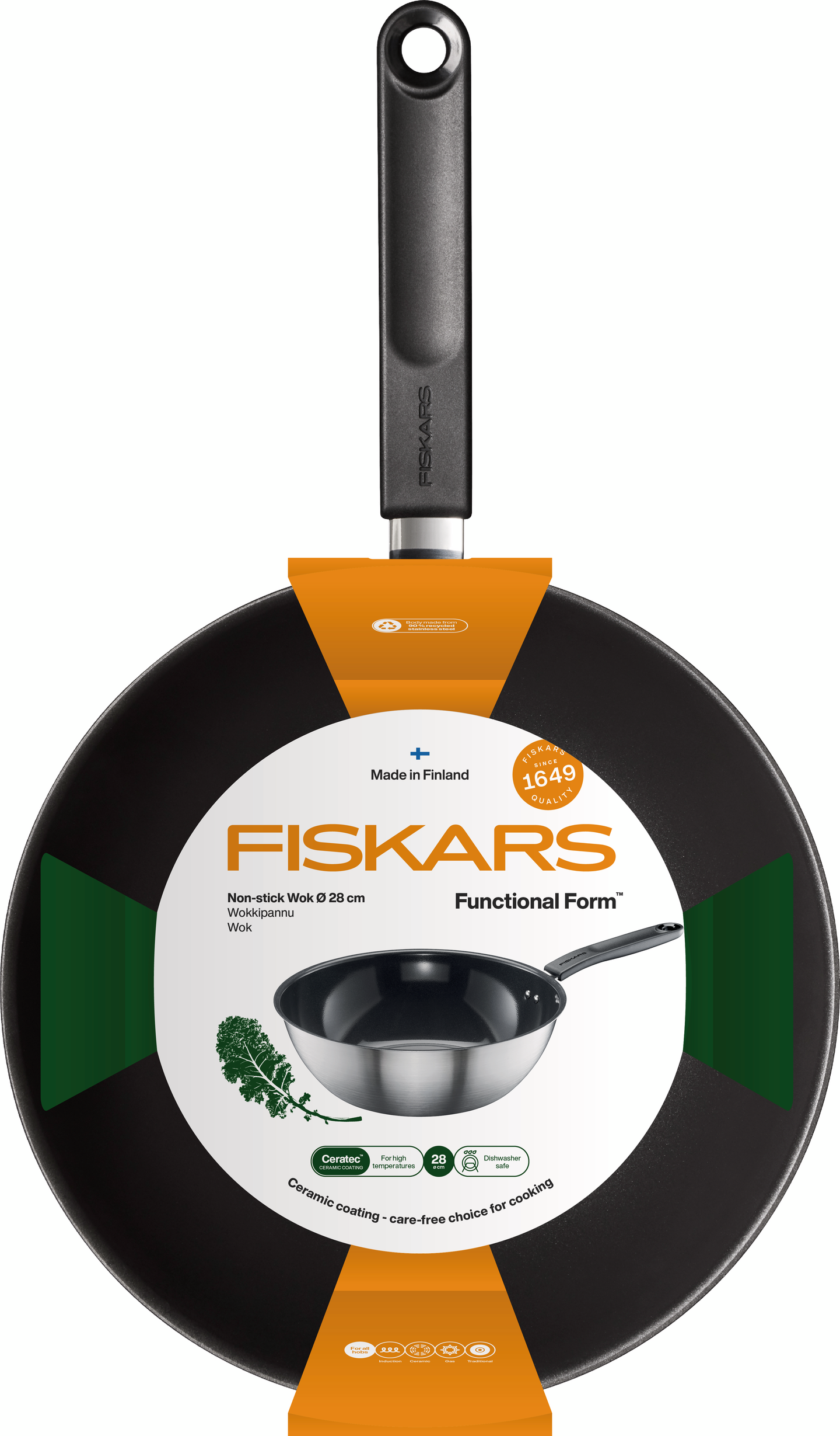 Fiskars Functional Form -wokkipannu on täydellinen valinta arjen ruoanlaittoon, ja se sopii erinomaisesti wokin tai curryn valmistukseen, joka sisältää kananmunia, kasviksia, lihaa, riisiä ja nuudeleita. Wokkipannun runko (28 cm) on valmistettu 90-prosenttisesti kierrätetystä ruostumattomasta teräksestä, ja sitä voi käyttää kaikenlaisilla liesillä, mukaan lukien induktioliedellä. Muoviton ja tarttumaton keraaminen Ceratec™-pinnoite on helppo puhdistaa, ja se kestää konepesun. Functional Form -wokkipannussa on kolmikerroksinen rakenne, joka kuumentaa ja paistaa ruoan tasaisesti kahvan pysyessä mukavan viileänä. Pannun maksimipaistolämpötila on 270 astetta, ja se on uuninkestävä 150 asteeseen saakka, mikä sujuvoittaa ruoanlaiton eri vaiheita. Valmistettu Suomessa (ISO 14001) ympäristösertifioidulla tehtaallamme.