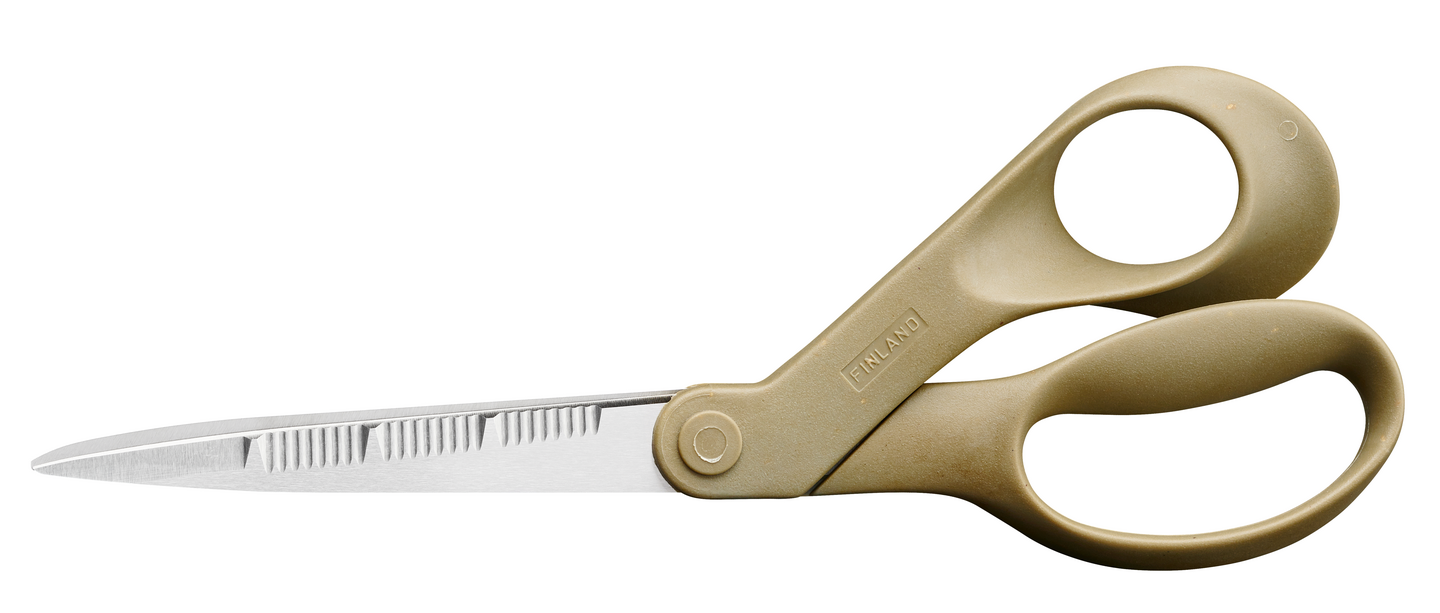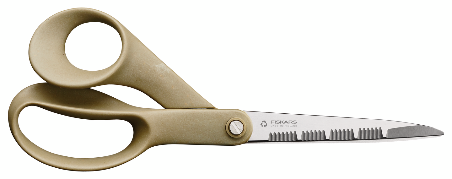 Fiskars ReNew -keittiösakset ovat luontoystävällinen vaihtoehto keittiön leikkuutöihin. Sakset on valmistettu 80-prosenttisesti kierrätetyistä ja 13-prosenttisesti uusiutuvista materiaaleista. Kestävät ja kierrätetyt, hammastetut terät pitävät leikkauskohteen paikallaan. Ergonomiset, kierrätysmuovista ja uusiutuvasta selluloosakuidusta valmistetut kahvat tarjoavat erinomaisen leikkuuotteen. Sakset on valmistettu kestävästi Suomessa ja sopivat oikeakätisille.