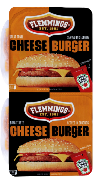 Kaksi maukasta hampurilaista. Mukana myös kätevä Heinz ketsuppipussi.