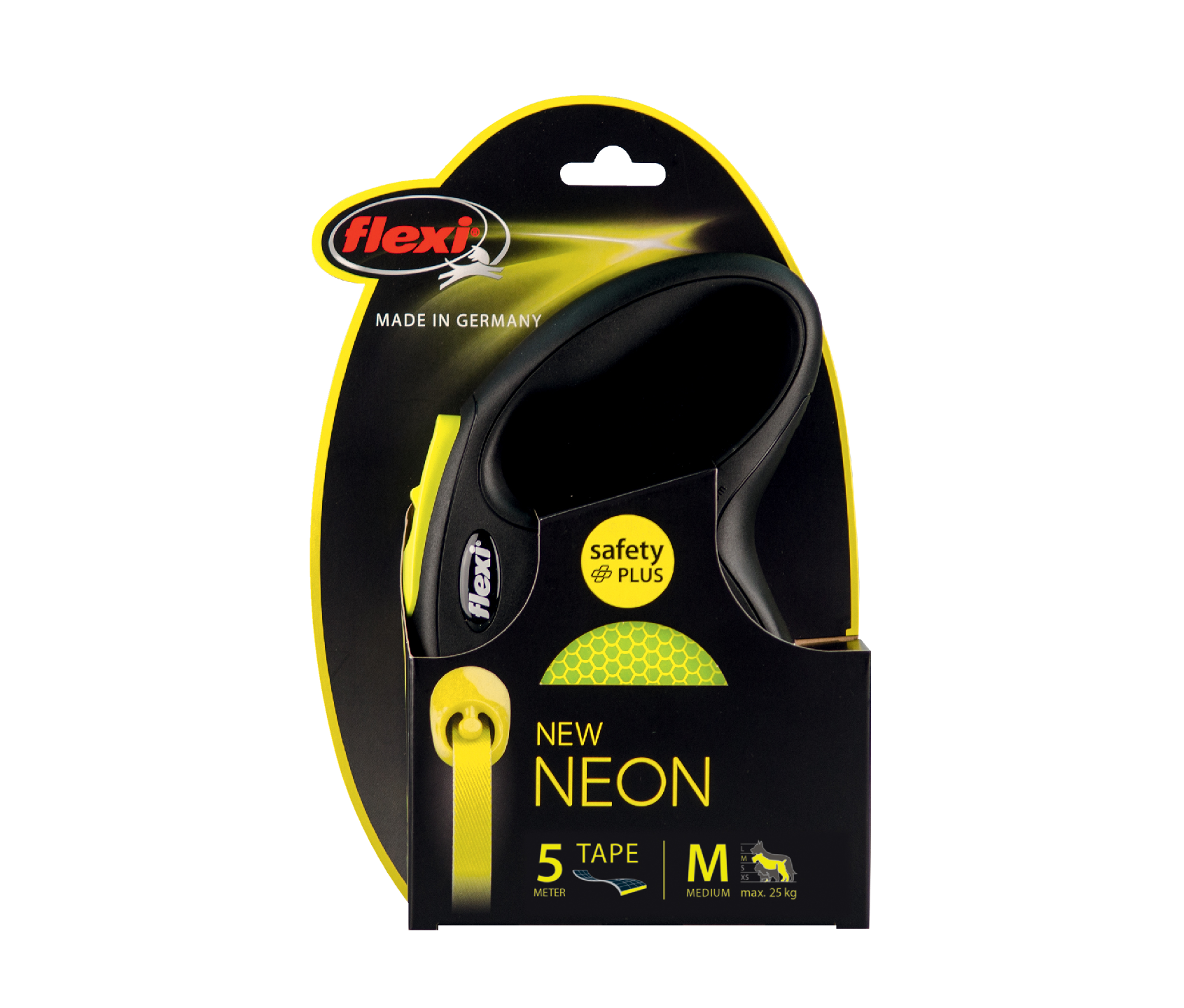 Flexi Neon Reflect -taluttimessa on uusi jarrumekanismi, joka toimii nopeasti ja varmasti - juuri silloin kuin sen pitääkin. Innovatiivinen nauhanohjuri huolehtii, ettei hihna jumitu ja aiheuta kiusallisia tilanteita. Taluttimen sivuissa on heijastimet. Neonkeltainen nauha erottuu hyvin pimeässä kaukaakin. Painoraja 25 kg. Flexi-taluttimet valmistetaan Saksassa. Jokainen talutin kootaan käsin ja ne läpikäyvät yli 90 laadunvalvonnan takastuspistettä ennen myyntiin tuloa. Siksi Flexi-taluttimen laatuun voi luottaa!