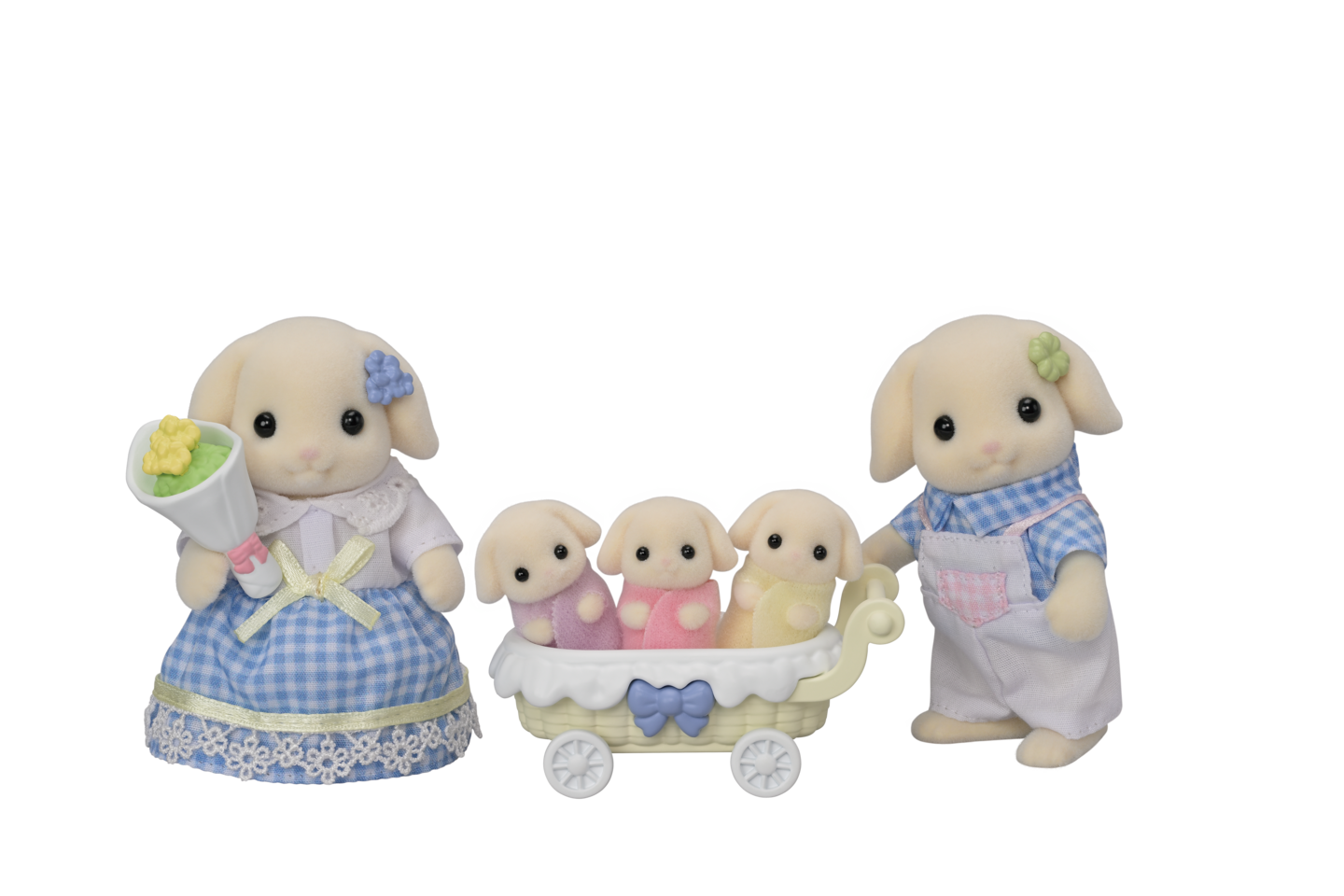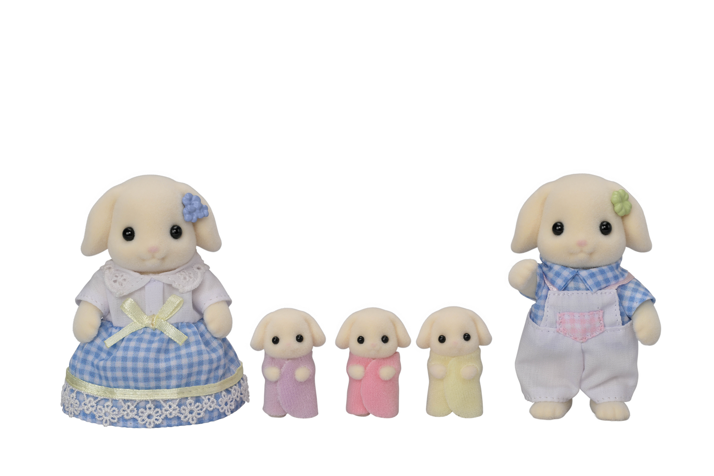 Setissä on viisihenkinen perhe: äiti, isä ja kolmoset. Hahmoilla on liikkuvat päät ja raajat, ja niiden vaatteet voi pukea ja riisua.