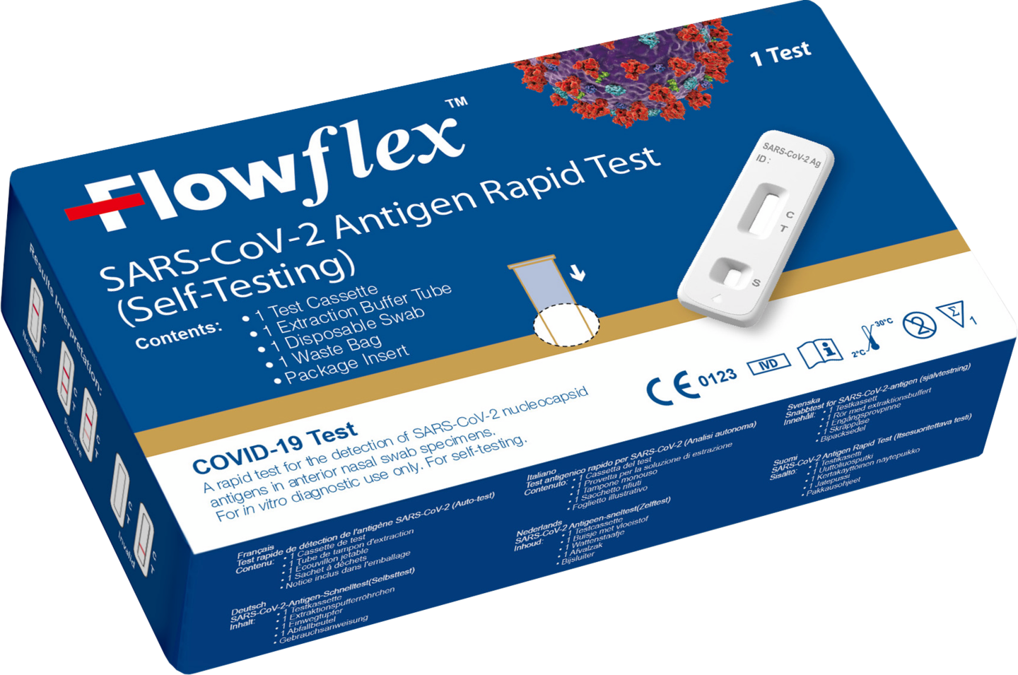-CE-sertifioitu (CE 0123) antigeenipikatesti kotikäyttöön. Tuote on lääkinnällinen laite, joka on tarkoitettu SARS-CoV-2-nukleokapsidiantigeenin tunnistamiseen nenän etuosasta otettavista näytteistä.