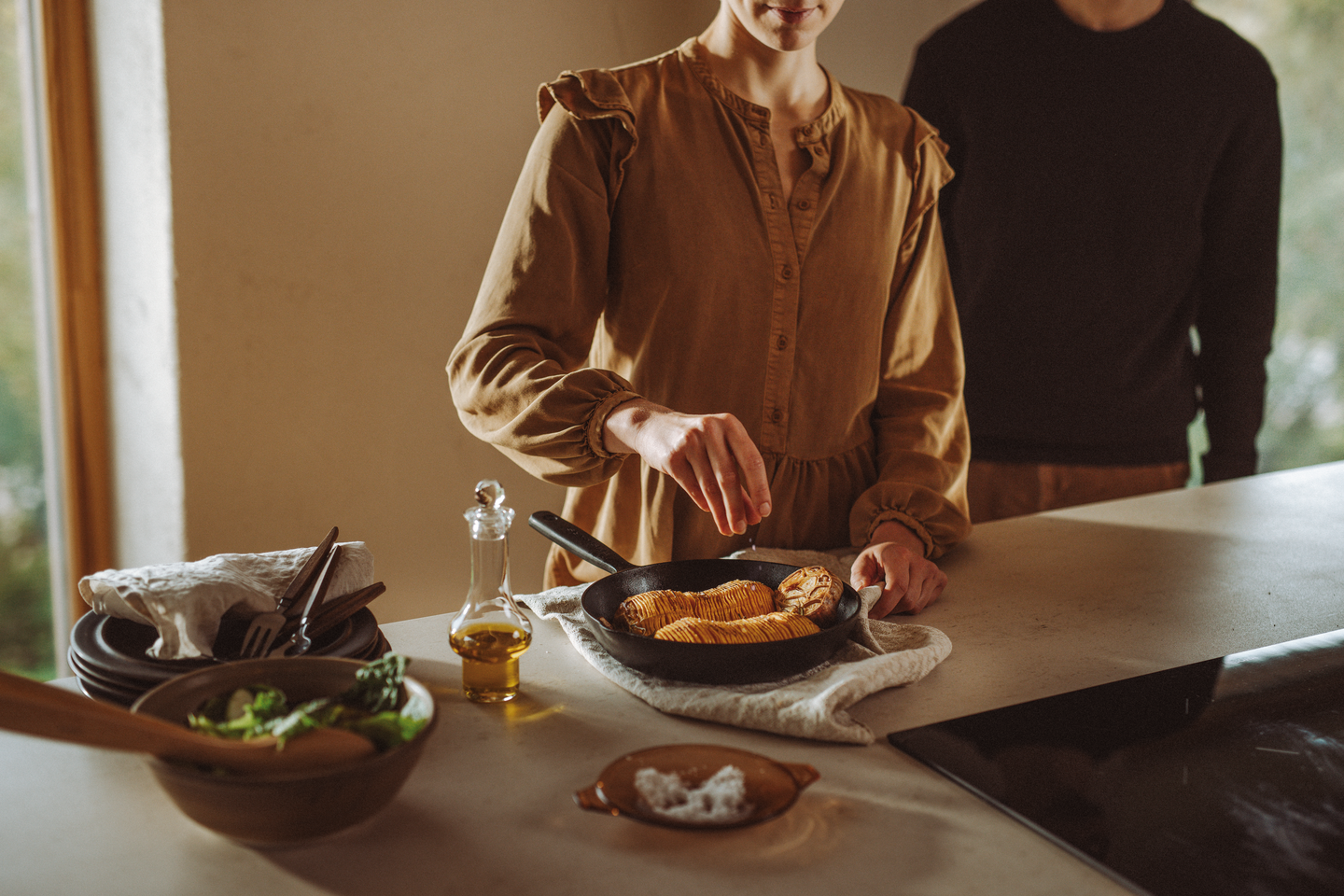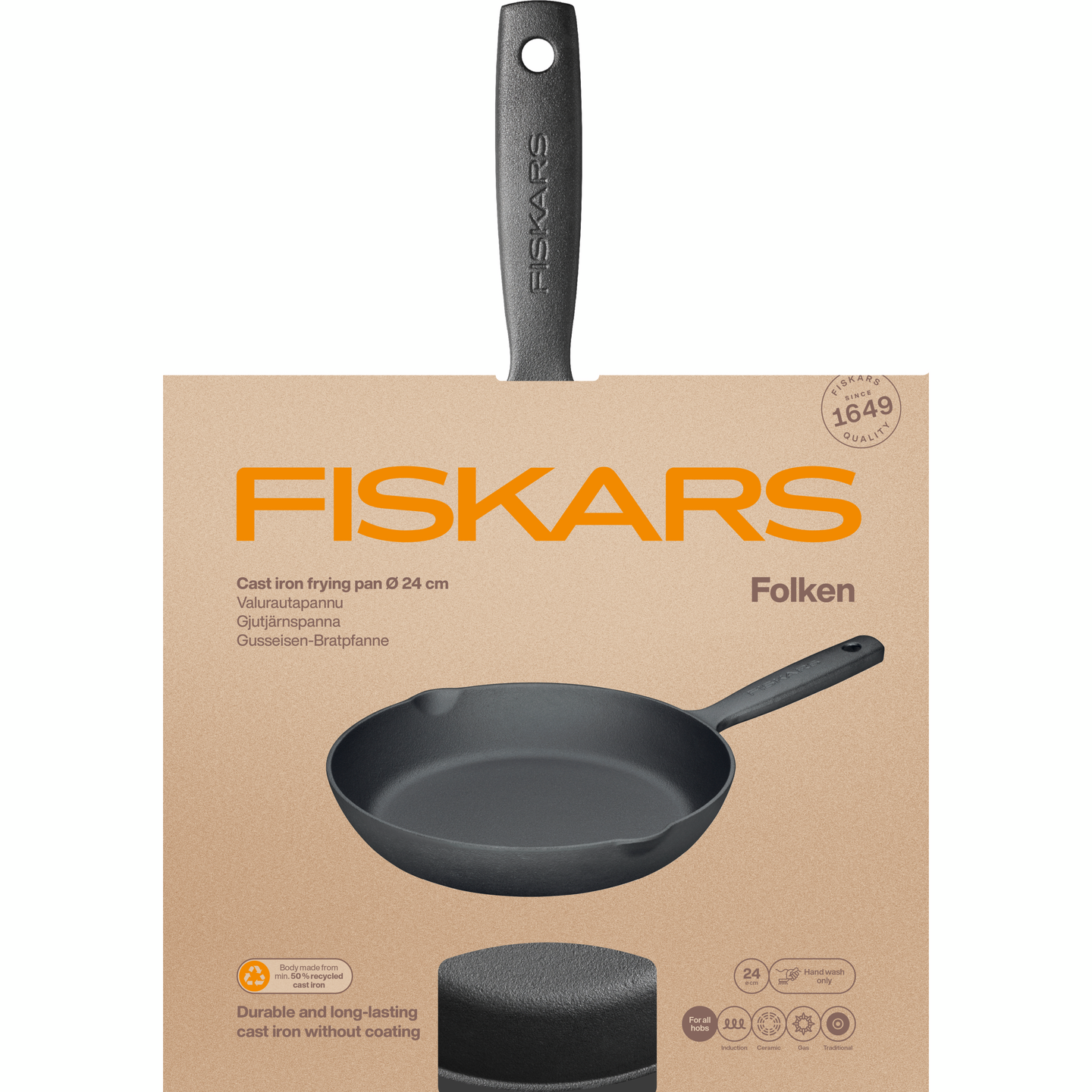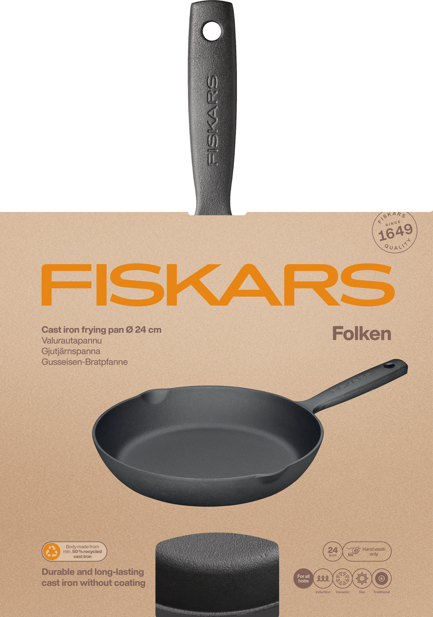 Perinneresepteillä syntyy autenttisia hetkiä, kun käytössä on Fiskars Folken -paistinpannu. Pelkistettyjen ja ajattomien Folken-keitto- ja paistoastioiden valmistukseen on käytetty vain olennaisimpia, vähäeleisiä materiaaleja, jotka takaavat aikaa kestävän ruoanvalmistuskokemuksen. Paistinpannu 24 cm on valmistettu kestävästä ja pinnoittamattomasta, kierrätetystä valuraudasta, ja se sopii erityisesti lihan, siipikarjan ja kasvisten ruskistamiseen tai paistamiseen. Valurauta lämpenee erittäin hyvin kaikenlaisilla liesillä, mukaan lukien induktioliedellä, sekä grillatessa ja avotulella. Se sopii ruoanlaittoon sekä korkealla että matalalla lämmöllä hitaasti, jakaen lämpöä tasaisesti. Folken-keitto- ja paistoastiat tekevät ruoanlaitosta miellyttävämpää, sillä ne ovat 30 % perinteisiä valurauta-astioita kevyempiä. Paistinpannussa on vankka, valettu kahva ja kaksi kaatonokkaa liemien, kastikkeiden ja muiden nesteiden poistamiseen pannulta. Pidä pannusta huolta rasvapolttamalla pannu ennen käyttöönottoa ja pesemällä se aina käsin. Pannu kestää maksimissaan 270 asteen paistolämpötilan ja uunin.