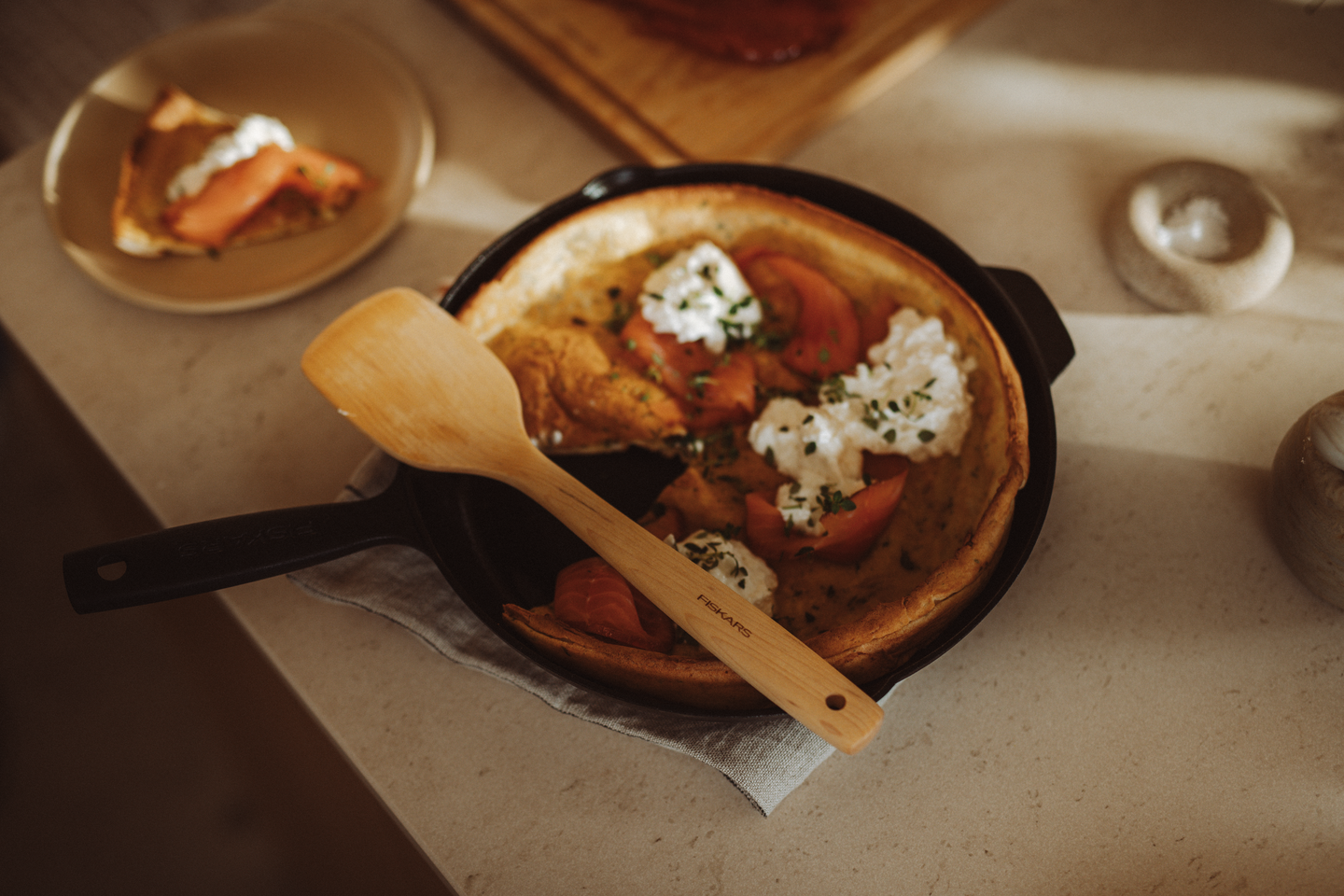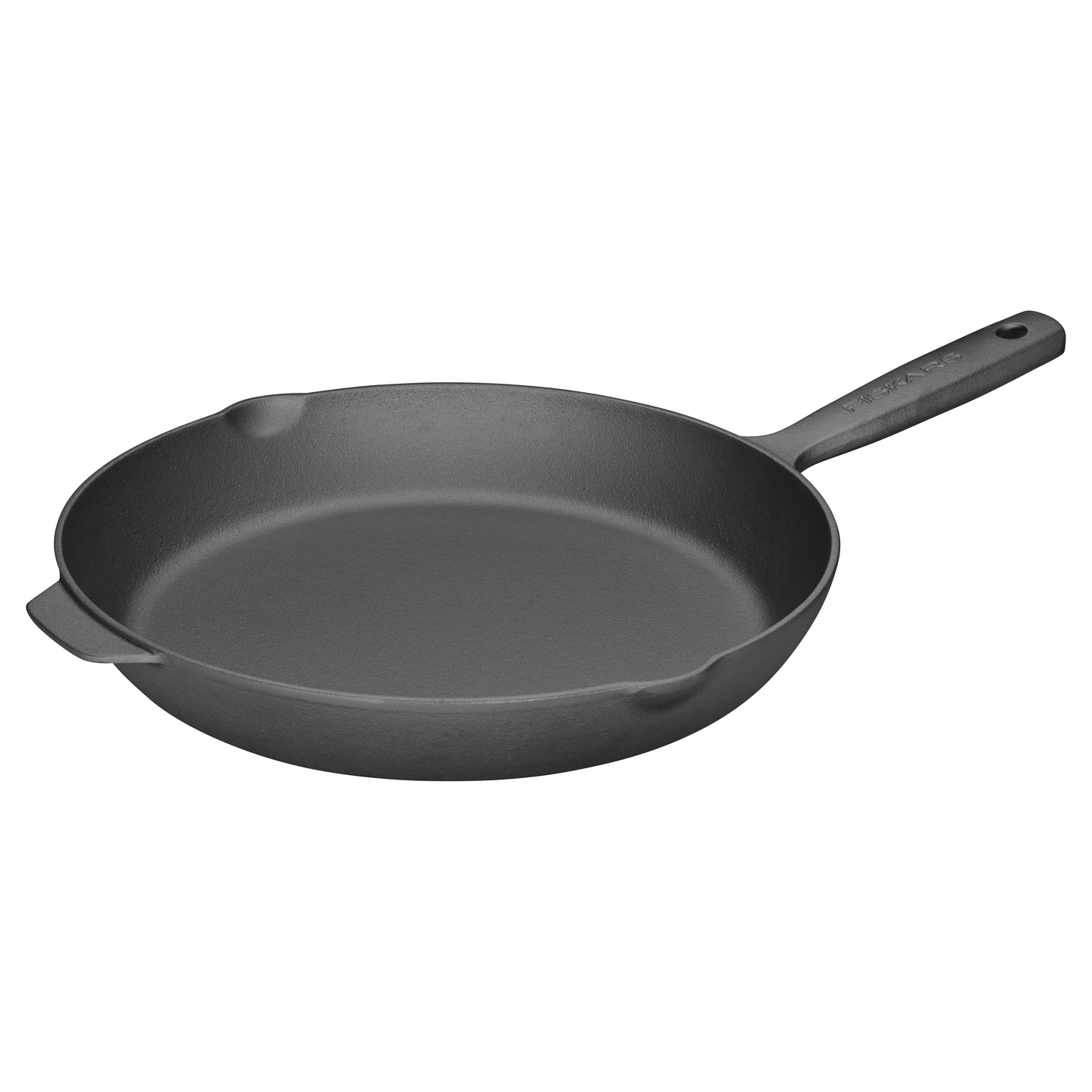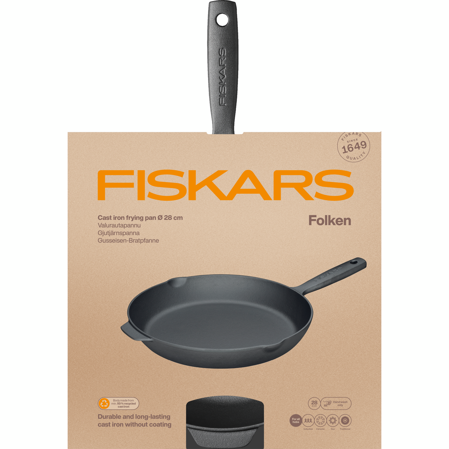 Perinneresepteillä syntyy autenttisia hetkiä, kun käytössä on Fiskars Folken -paistinpannu. Pelkistettyjen ja ajattomien Folken-keitto- ja paistoastioiden valmistukseen on käytetty vain olennaisimpia, vähäeleisiä materiaaleja, jotka takaavat aikaa kestävän ruoanvalmistuskokemuksen. Paistinpannu 28 cm on valmistettu kestävästä ja pinnoittamattomasta, kierrätetystä valuraudasta, ja se sopii erityisesti lihan, siipikarjan ja kasvisten ruskistamiseen tai paistamiseen. Valurauta lämpenee erittäin hyvin kaikenlaisilla liesillä, mukaan lukien induktioliedellä, sekä grillatessa ja avotulella. Se sopii ruoanlaittoon sekä korkealla että matalalla lämmöllä hitaasti, jakaen lämpöä tasaisesti. Folken-keitto- ja paistoastiat tekevät ruoanlaitosta miellyttävämpää, sillä ne ovat 30 % perinteisiä valurauta-astioita kevyempiä. Paistinpannussa on vankka, valettu kahva ja kaksi kaatonokkaa liemien, kastikkeiden ja muiden nesteiden poistamiseen pannulta. Pidä pannusta huolta rasvapolttamalla pannu ennen käyttöönottoa ja pesemällä se aina käsin. Pannu kestää maksimissaan 270 asteen paistolämpötilan ja uunin.