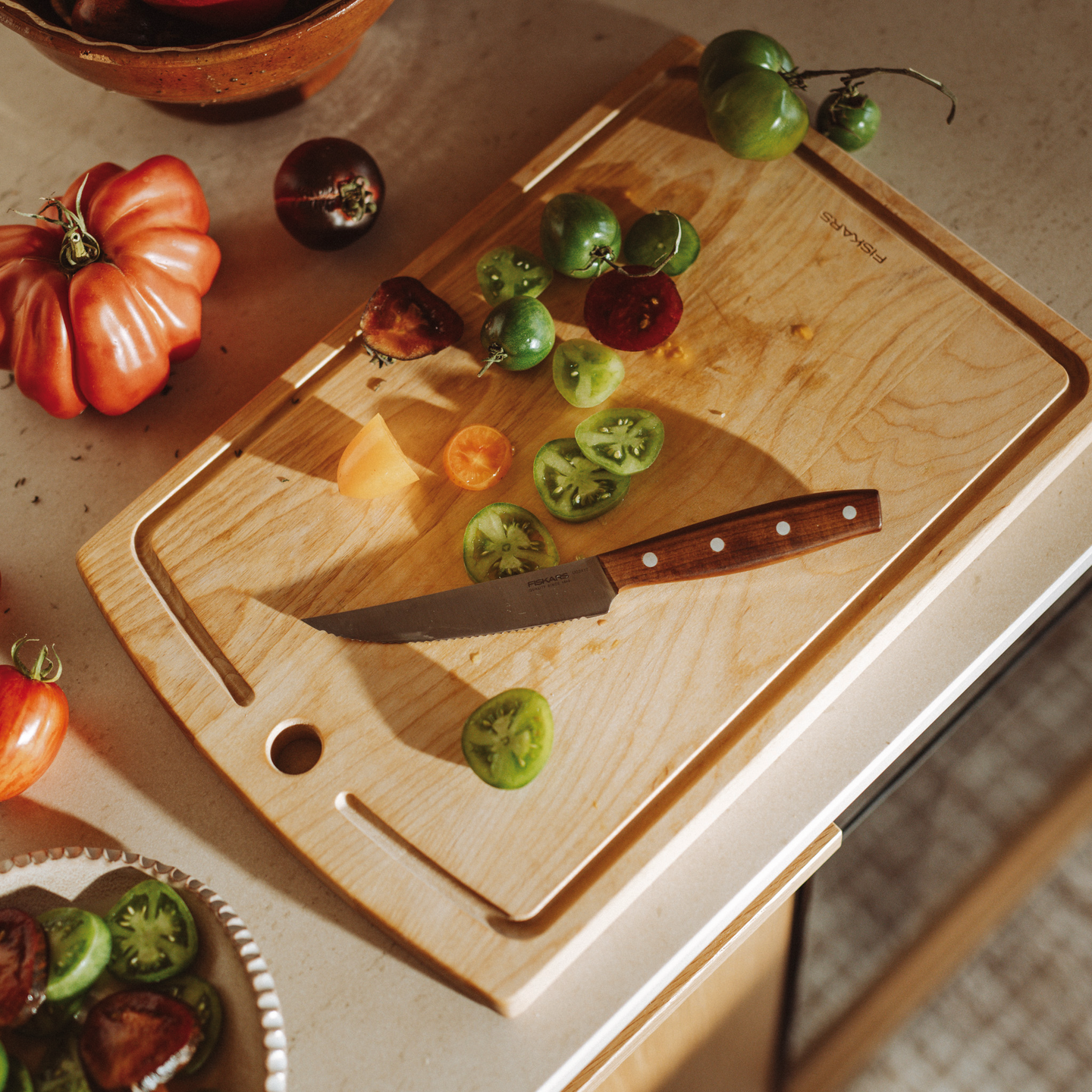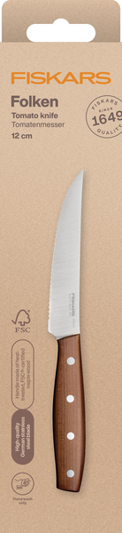 Perinneresepteillä syntyy autenttisia hetkiä, kun käytössä on Fiskars Folken -tomaattiveitsi 12 cm, jonka sahalaitainen terä sopii ohutkuoristen ruoka-aineiden kuten tomaattien, paprikoiden ja persikoiden tarkkaan leikkaamiseen. Pelkistettyjen ja ajattomien Folken-veisten valmistukseen on käytetty vain olennaisimpia, vähäeleisiä materiaaleja, jotka takaavat aikaa kestävän ruoanvalmistuskokemuksen. Veitset on valmistettu saksalaisesta ruostumattomasta teräksestä taaten Fiskarsille ominaisen laadun ja tarkkuuden. Folken-veisten kahvat ovat vastuullisesti hankittua FSC®-sertifioitua vaahteraa (FSC C108780), mikä antaa niistä jokaiselle uniikin, luonnollisen ilmeen. Mukava, ergonominen kahva tarjoaa helppoutta ja hyvän hallinnan tunnun leikatessa. Folken-veisten liuottamista tai veteen upottamista tulee välttää. Pitkäikäisyyden takaamiseksi ne tulee pestä käsin ja kuivata heti käytön jälkeen.