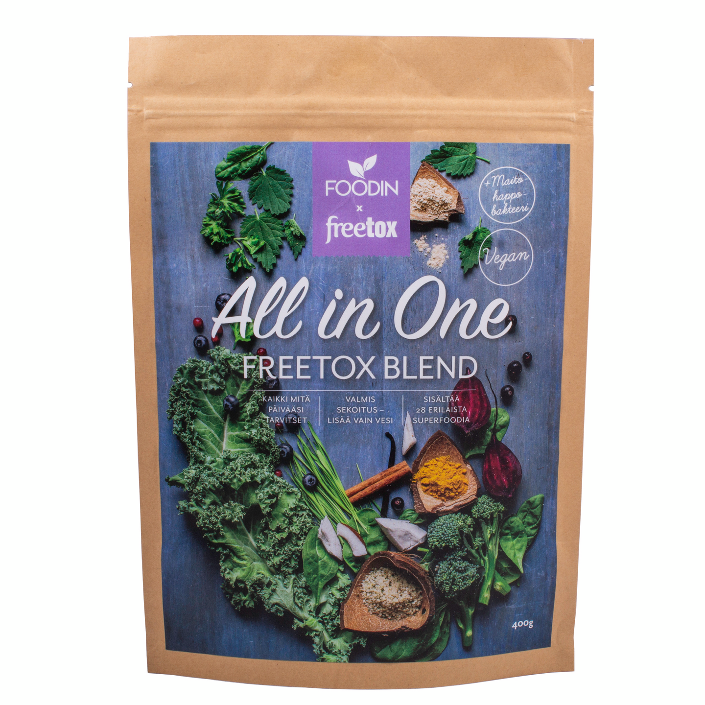 All in One- Freetox Blend on monipuolinen jauhesekoitus. Se sopii niin aamuun, välipalaan tai treenisi tueksi. Freetox tietää kuinka aamukiukkuiset lapset kainalossa juostaan autoon ja kohti päiväkotia, koulua tai eskaria. Freetox tietää myös ne työpäivät, kun aamupala taikka lounas on kokonaan unohdettu. Myös ne päivät kun välipalaksi olisi tarjolla vain kampaviineri ja kuppi sitä marketin kahvia. Oletko koskaan toivonut tällaisiin hetkiin helppoa ravintovaihtoehtoa? Freetox tietää myös pätkäpaastot, tarjoaa nyt niihin juomavaihtoehdon, jolla pärjäät loistavasti paaston ajan. Voit sekoittaa jauheen haluamasi nesteen joukkoon, lisätä smoothieen tai ripotella aamupuuron päälle. Suositeltu annoskoko: 4 rkl 3dl vettä Pakattu tehtaassa, jossa käsitellään pähkinöitä (cashew-, para-, pekaani-, pistaasi-, macadamia-, hassel- ja saksanpähkinöitä) mantelia, seesaminsiemeniä ja heraproteiinia (maidosta).