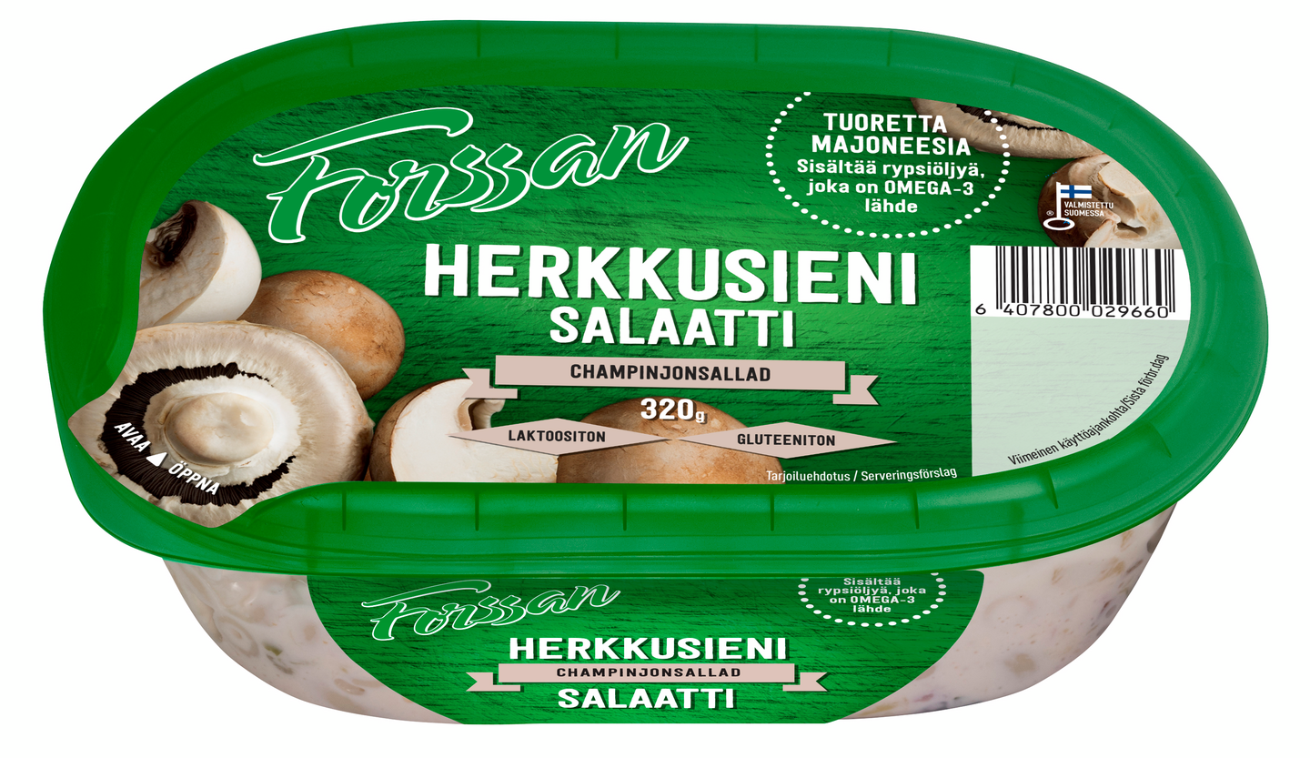 Täyteläinen herkkusienisalaatti maistuu joulupöydässä, blinien täytteenä, lisukkeena ja myös arkena leivän päällä. Salaatti on valmistettu tuoreeseen majoneesiin ja herkkusieniin, lisäksi makumaailmassa yhdistyvät säilykekurkku ja sipuli. Vaikka herkkusienisalaatti onkin erityisen suosittu joulupöydässä, se ei ole sesonkituote vaan ostettavissa ympäri vuoden. Maukas herkkusienisalaatti sopii myös grilliherkkujen kaveriksi. Herkkusienisalaattia voidaan käyttää jopa voileipäkakun täytteenä. Valmistujaisten tai merkkipäivien juhlapöytään herkkusienisalaatti sopii sellaisenaan. Juhlallisemman version salaatista saa koristelemalla se esimerkiksi silputulla ruohosipulilla. Forssan Herkkusienisalaatti on pakattu kätevään rasiaan, joka on helppo kuljettaa ulos piknikille tai grillikatoksen alle.