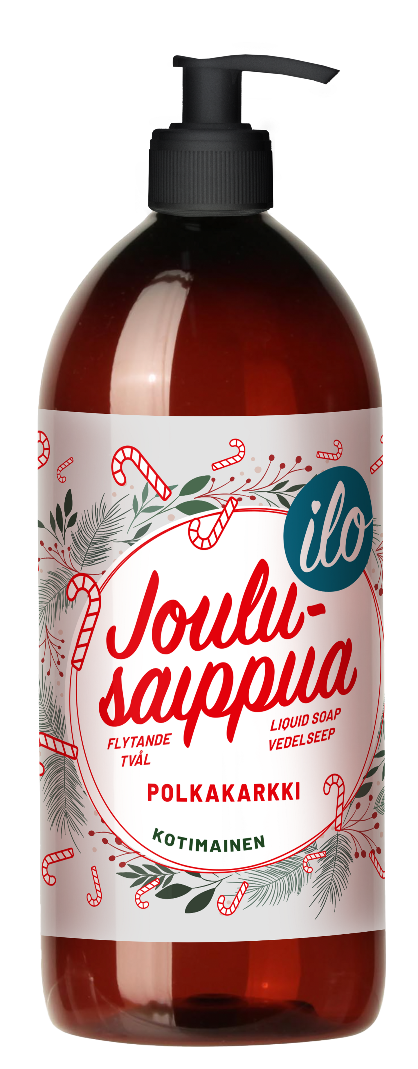 Jouluinen nestesaippua, polkakarkin tuoksu. Ilo nestesaippuat sopivat käsien ja koko vartalon pesuun. Niissä ei ole käytetty eläinperäisiä raaka-aineita. Avainlippumerkki on osoituksena suomalaisesta työstä.