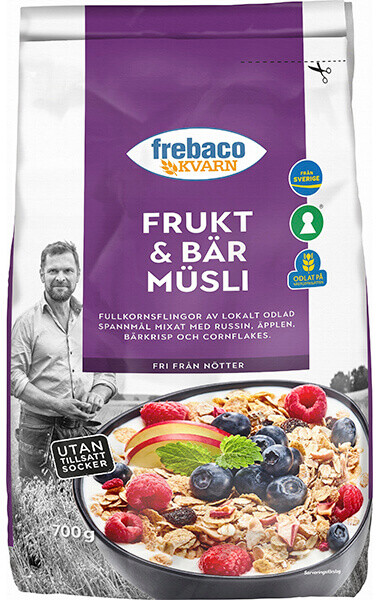 Basen i den här müslin består av fullkornsflingor av lokalt odlad havre, vete, råg och korn. Vi har också lagt i krispiga bitar av blåbär, hallon och torkade äpplen samt russin och fiberberikade cornflakes. Det ger en smakrik müsli med gott om fullkorn och fiber. Givetvis utan tillsatt socker.\n\nAlla våra produkter är är fria från nötter och mandel. Vi har en nöt- och mandelfri produktion.