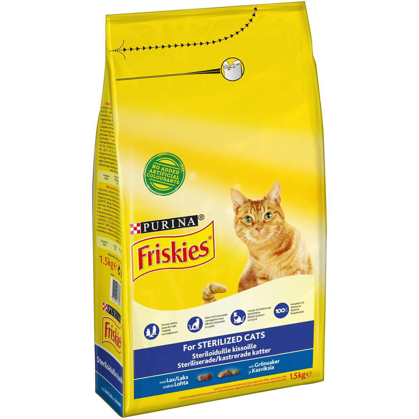 Friskies Sterilised on 100 % täyttä ja tasapainoista ravintoa, joka on suunniteltu erityisesti kastroitujen ja steriloitujen kissoje n tarpeisiin ja edistämään niiden terveyttä. Sen tasapainoinen proteiinin ja rasvan suhde auttaa kissan ihannepainon ylläpidossa. Hy vä kivennäisaine- ja vitamiinitasapaino edistää kissan virtsateiden terveyttä ja tukee sen luonnollista vastustuskykyä.