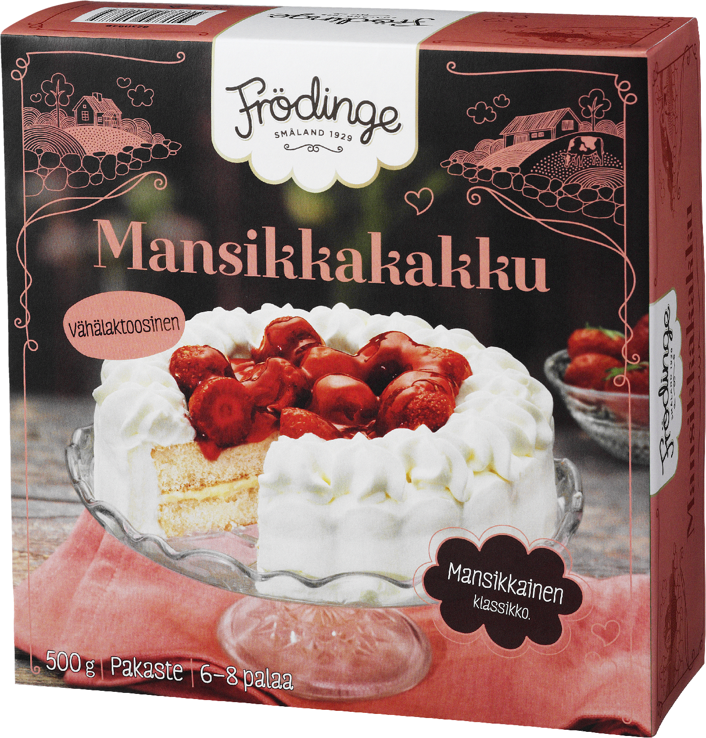 Frödinge® mansikkakakku tuo herkullista kesätunnelmaa niin juhlaan kuin arkeen. Mehevän kakkupohjan täytteenä on maukasta vaniljakreemiä ja kakun päällä on kermavaahtoa ja runsaasti mansikoita. Se on helppo, laktoositon kahvipöydän herkku ja jälkiruoka. Frödinge pakastekakku on sellaisenaan käyttövalmis: poista vain kartonkipakkaus ja sulata muovikupu päällä noin 4 tuntia huoneenlämmössä tai 5 tuntia jääkaapissa ja nauti. Kakusta tulee noin 6-8 annosta.