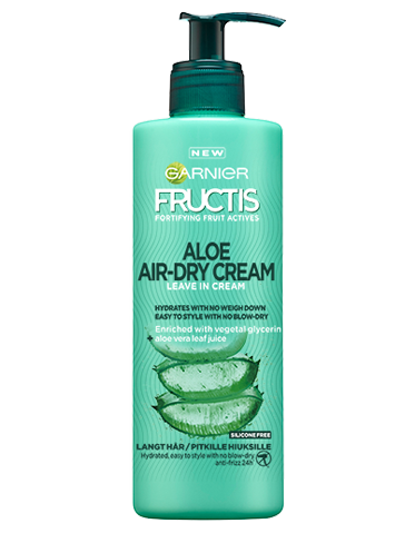 Fructis Aloe Air-Dry-voide sisältää erittäin kosteuttavaa aloe vera -geeliä ja luonnollista alkuperää olevaa kasvisglyserolia. Koostumus kosteuttaa hiuksia latistamatta niitä sekä tekee muotoilusta helppoa ilman föönausta. Anna ilman kuivattaa hiuksesi!