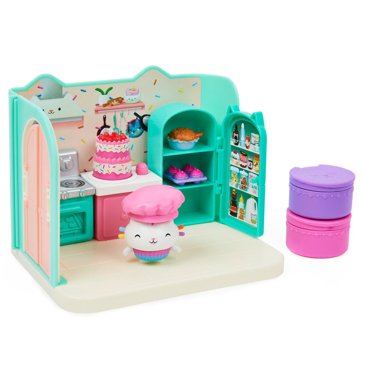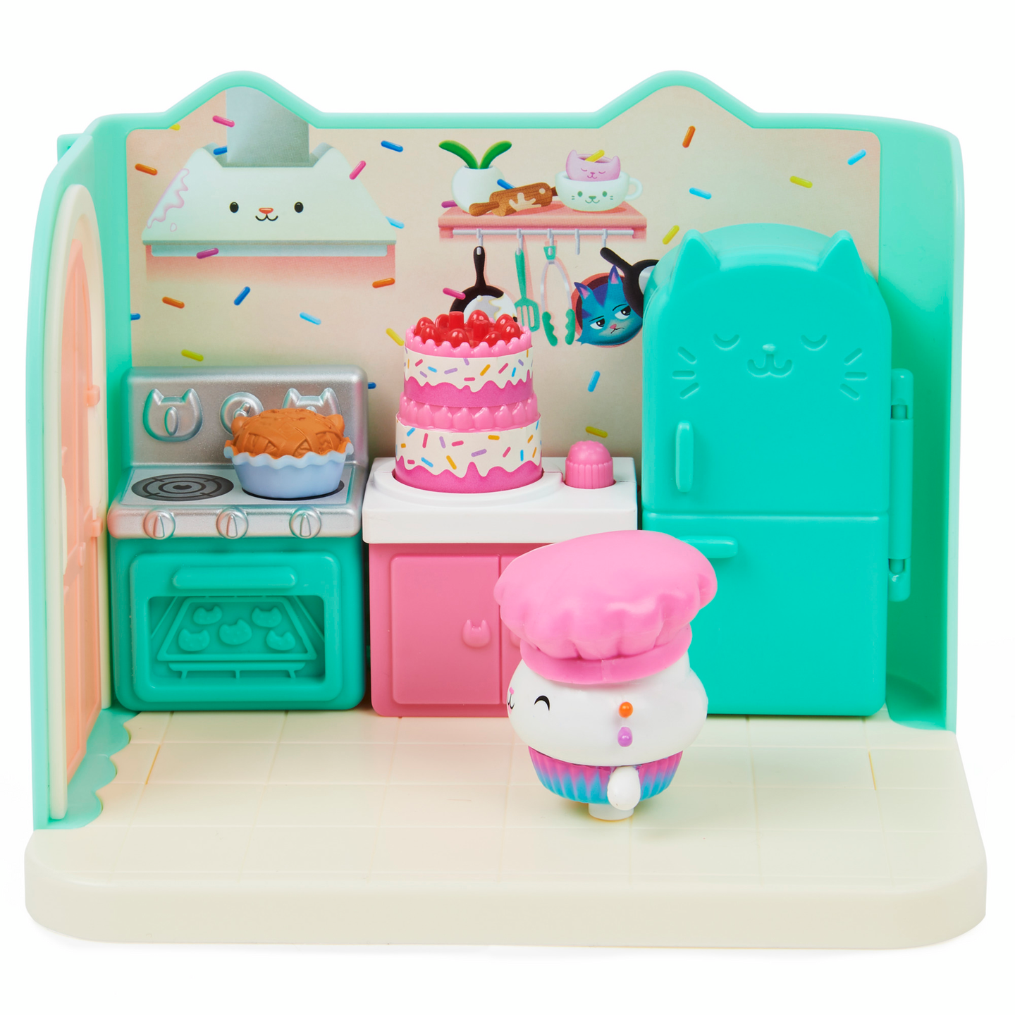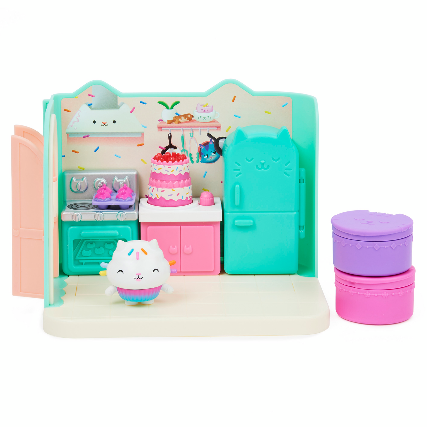 Vietä rentouttava kylpyläpäivä Merikatin kanssa Gabbyn Nukketalon Hemmottelu- kylpyhuoneessa. Tämä ylellinen Gabbyn Nukketalo- leikkisetti on täynnä hauskoja yksityiskohtia ja yllätyksiä tutkittavana, se herättää ohjelman taianomaisen kylpyhuoneen henkiin. Avaa laatikko ja löydät Merikatti- keräilyfiguurin, kolme huonekalua, kumiankka- kissatarvikkeen sekä kaksi Nukketalopakettia, joiden sisällä on yllätystarvikkeet. Aivan kuten Gabby tekee jokaisen jakson aluksi, avaa omat erityiset Nukketalopakettisi ja löydät setin mysteeritarvikkeet: hajuvesipullon ja pyyhekääreen kurkkunaamion kanssa, joita Merikatti voi todella käyttää. Liu’uta kääre Merikatin päähän ja laita hänet ammeeseen kumikisun kanssa rauhoittavaa vaahtokylpyä varten. Kun painat kylpyä alaspäin, kuplat liikkuvat. Se on niin hauskaa. Irrota pyyhe ja laita se kisukylpyhuonekärryyn säilytystä varten ja siirry sitten peilipöydän ääreen hemmoteltavaksi. Käännä peilipöydän peili ympäri paljastaaksesi söpön vedenalaisen maiseman. Monilla ominaisuuksilla varustettu Merikatin hemmottelu kylpyhuone on täydellinen jännittävään kuvitteluleikkiin ja se on loistava lahja lapsille. Käytä sitä Leivo Hileen kanssa- keittiön ja Lepokatin Kauniiden unien- makuuhuoneen kanssa (molemmat myydään erikseen) rakentaaksesi oman Gabbyn Nukketalo maailmasi. Lisäksi voit jopa liu’uttaa kylpyhuoneen Gabbyn Purrfect Nukketaloon (myydään erikseen) löytääksesi lisää tapoja leikkiä nukketaloseikkailuitasi. Viimeisen yllätyksen saat skannaamalla yhden Nukketalopaketin sisällä olevan QR- koodin, saat erikoispalkinnon ilmaisessa Gabbyn Nukketalo- sovelluksessa (saatavilla iOS- ja Android- käyttöjärjestelmissä). Hemmottele Merikattia Gabbyn Nukketalon Hemmottelu- kylpyhuoneessa.