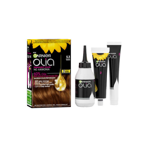 Garnier Olia 5.3 Golden Brown, kestoväri ilman ammoniakkia, jonka koostumus sisältää 60% öljyjä*, antaa maksimaalisen värjäystuloksen ja tekee hiuslaadusta näkyvästi paremman. Olia 5.3 peittää harmaat hiukset jopa 100% ja on miellyttävä hiuspohjalle. 98% naisista ei havainnut näkyviä vaurioita** hiuksissaan. *Värivoiteessa **Kuluttajatutkimus, 262 naista, käytettäessä koko pakkaus.