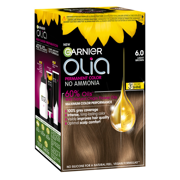 Garnier Olia 6.0 Light Brown, kestoväri ilman ammoniakkia, jonka koostumus sisältää 60% öljyjä*, antaa maksimaalisen värjäystuloksen ja tekee hiuslaadusta näkyvästi paremman. Olia 6.0 peittää harmaat hiukset jopa 100% ja on miellyttävä hiuspohjalle. 98% naisista ei havainnut näkyviä vaurioita** hiuksissaan. *Värivoiteessa **Kuluttajatutkimus, 262 naista, käytettäessä koko pakkaus.