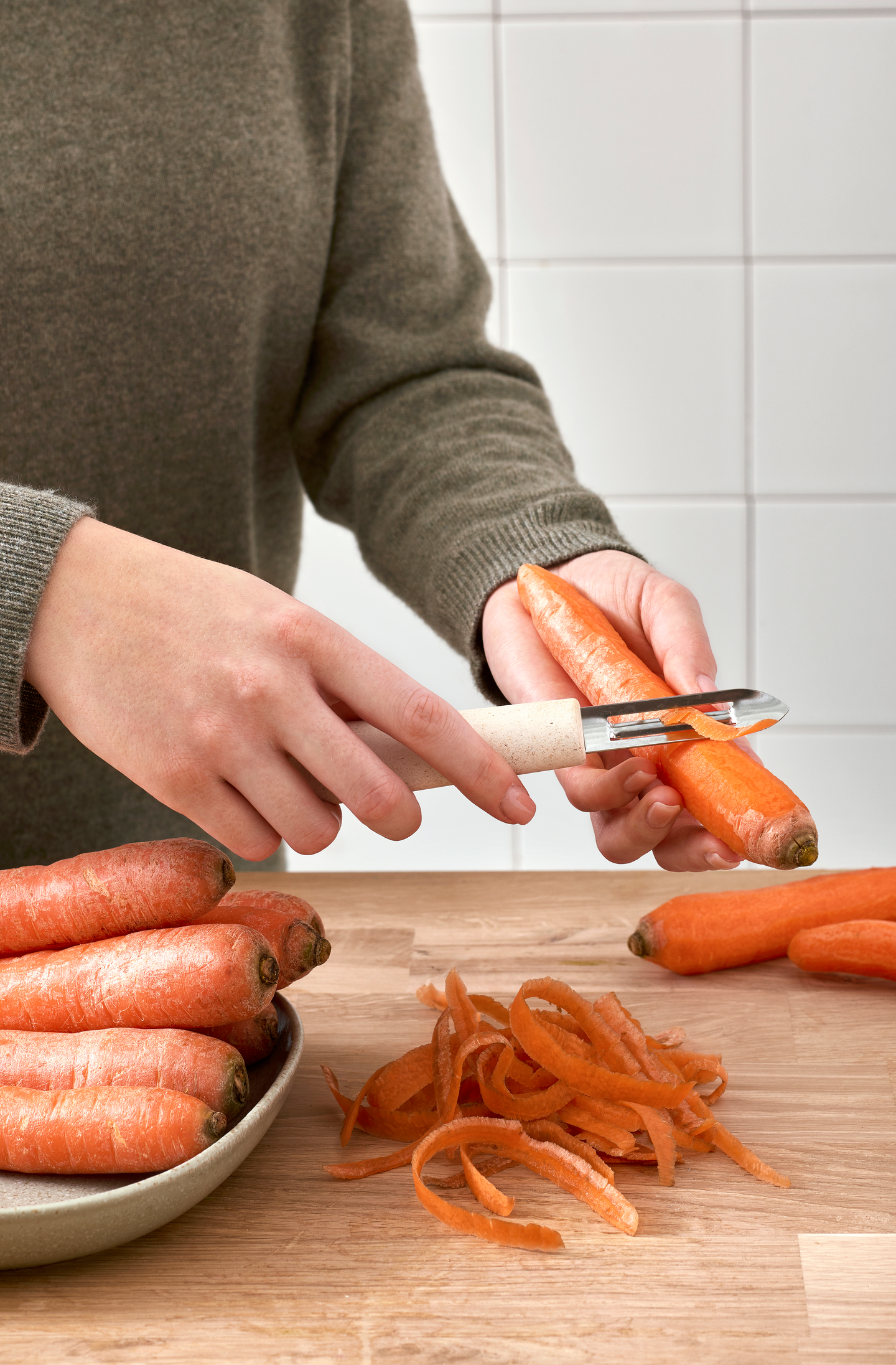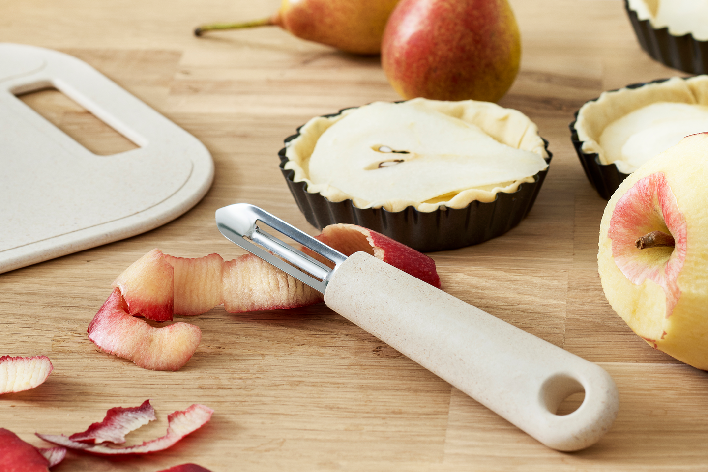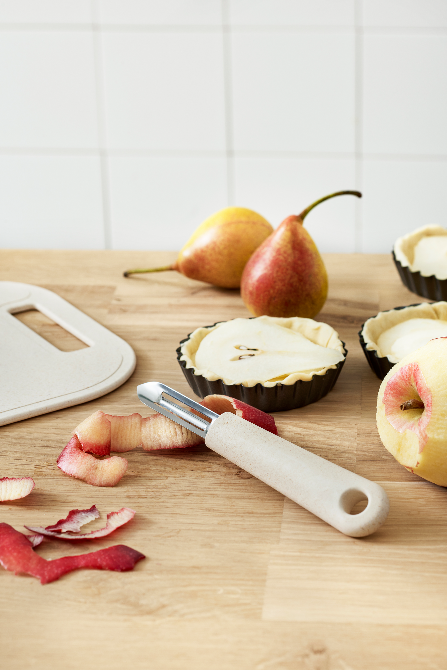 Kuorimaveitsi ruostumattomasta teräksestä valmistetulla terällä. Valmistettu BPA-vapaasta materiaalista. Kädensija on valmistettu biopohjaisesta muovista, yhdistelmä sokeriruokoa ja pohjoismaista puukuitua. Kädensijan hiilijalanjälki on pienempi verrattuna perinteisestä muovista valmistettuun vastaavaan. Keittiötyövälineet palkittiin German Design Award -palkinnoilla vuonna 2020.