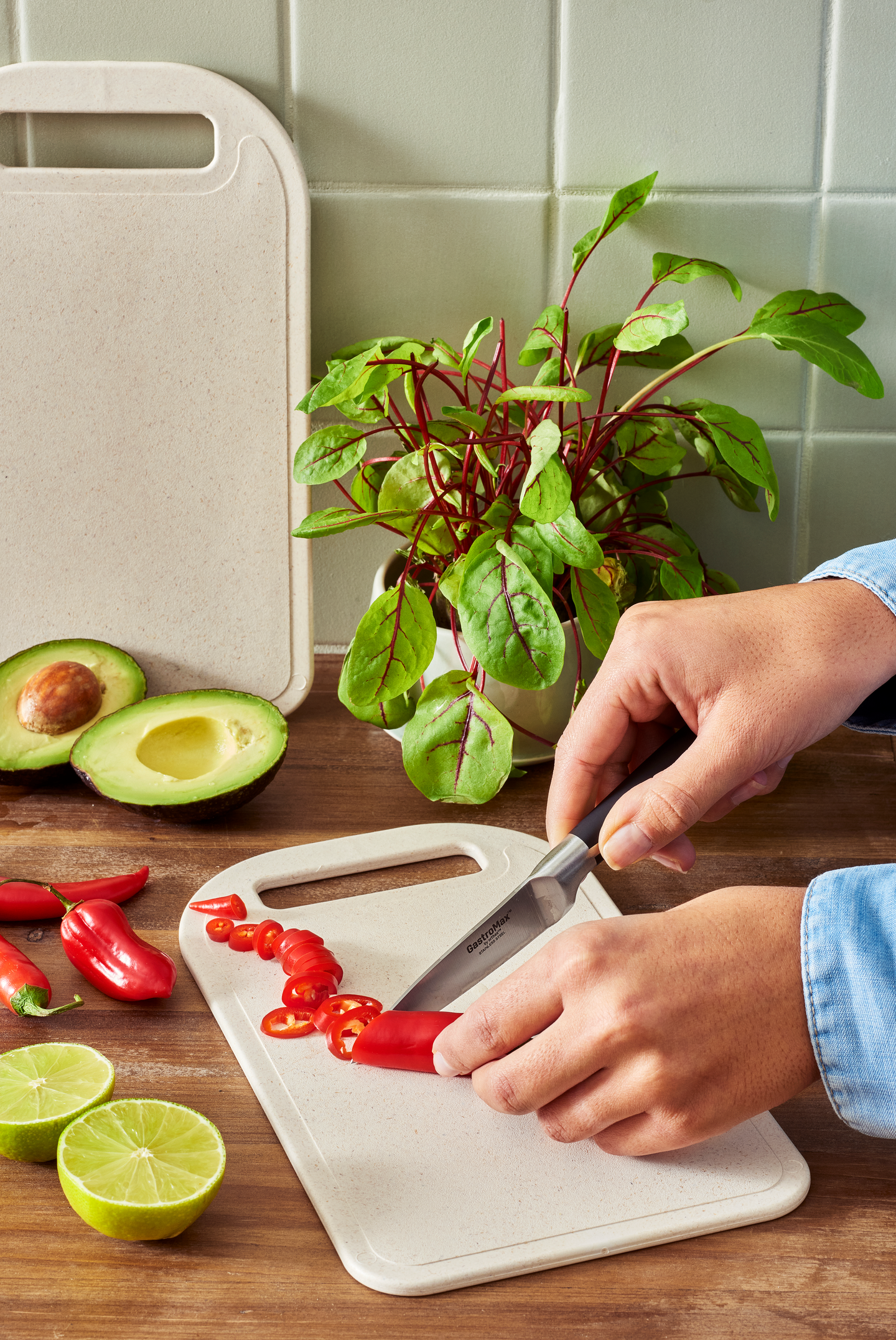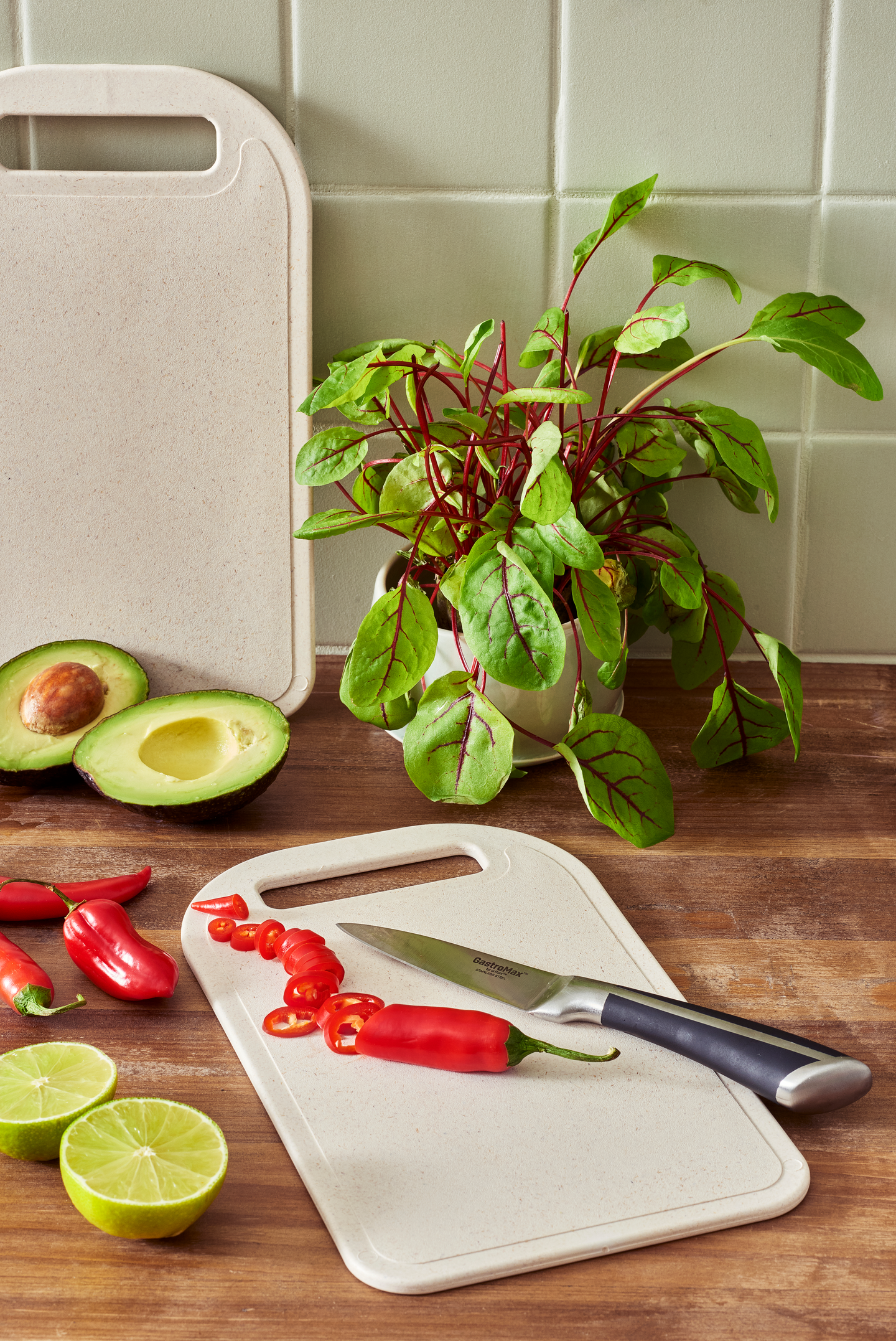 Valmistettu biopohjaisesta muovista, yhdistelmä sokeriruokoa ja pohjoismaista puukuitua. Leikkuulaudan hiilijalanjälki on pienempi verrattuna vastaavaan perinteisestä muovista valmistettuun tuotteeseen. Leikkuulauta on kestävä käytössä ja helppo pitää puhtaana. Saatavilla useassa koossa.