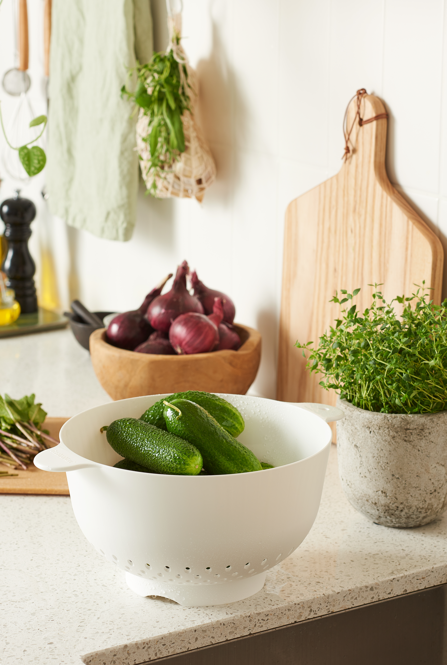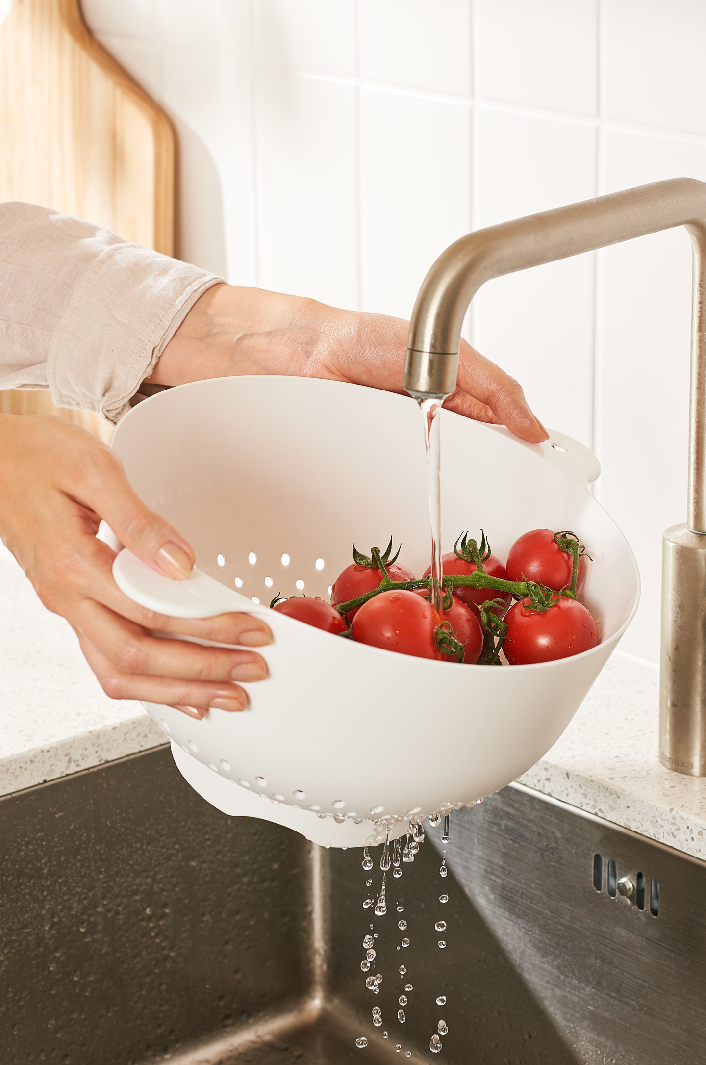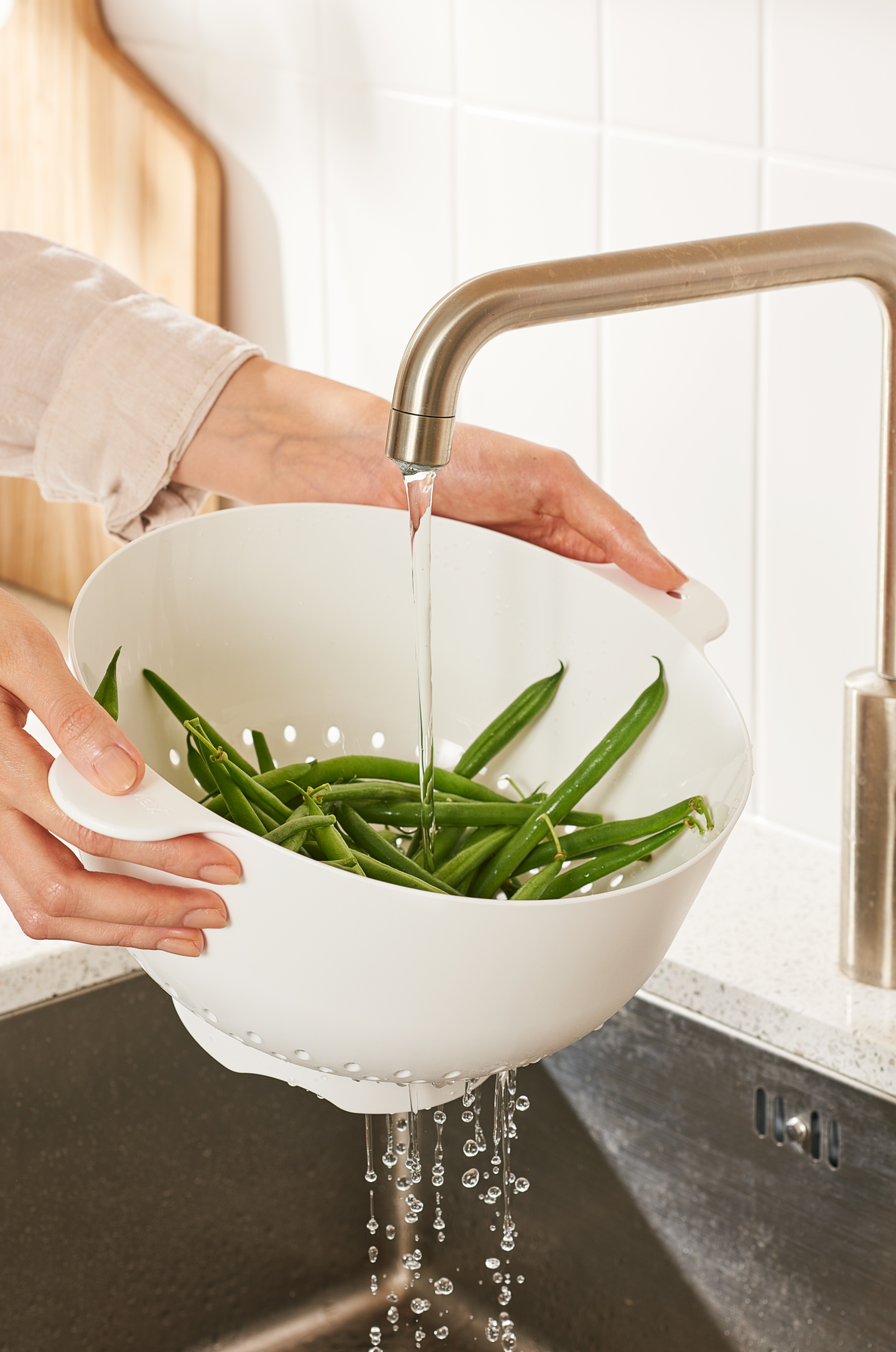 Sopii hyvin salaatin pesemiseen, vihannesten huuhteluun tai pastaveden pois kaatamiseen. Seisoo tukevasti alustalla, korotetun jalkaosan ansiosta elintarvikkeet eivät kosketa esim. tiskialtaan pohjaa.