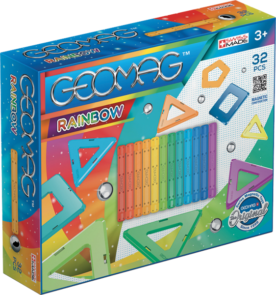 Geomag Rainbow magneettirakennussarja. Rakenna mielikuvituksellisia ja värikkäitä rakennelmia. Pakkaus sisältää 32 värikästä osaa.