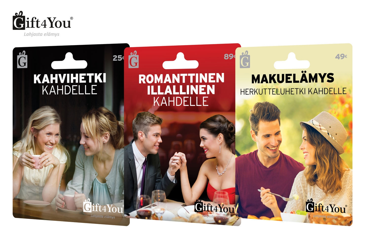 Gift4You-elämyslahjakortit tarjoavat monipuolisen valikoiman ainutlaatuisia elämyksiä makunautintojen, liikunnan, kulttuurin, matkailun, hemmottelun ja hyvinvoinnin tai muiden unohtumattomien kokemusten parissa. Ravintola- ja kahvilapalveluihin suunnatut lahjakortit on mainio lahja kaikille hyvän ruoan ja makunautintojen ystäville. Tutustu tarkemmin Gift4You.fi verkkosivuilla. Lahjakorttien valikoima saattaa vaihdella kaupoittain.