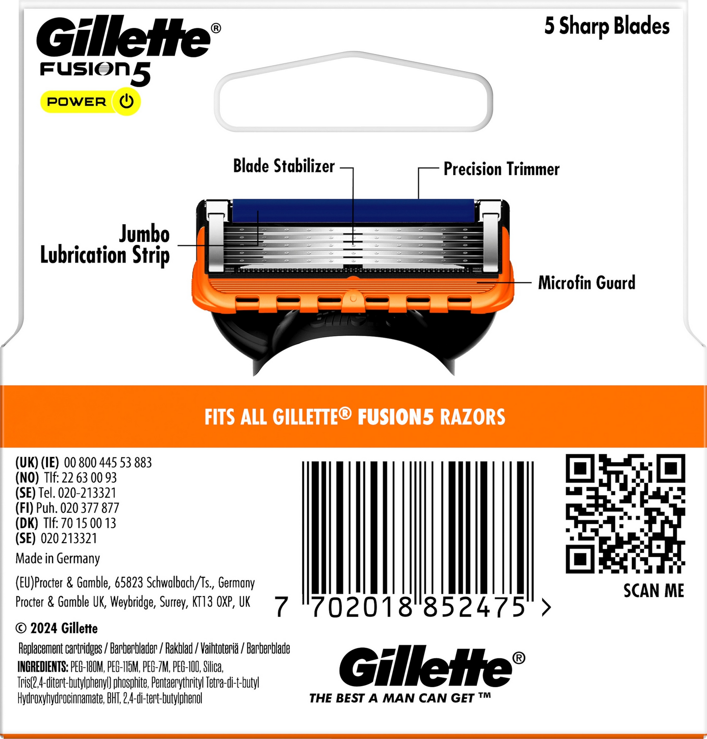 Gillette Fusion5 Power -vaihtoterillä saat tarkemman ja pidempikestoisen lopputuloksen*. Niissä on 5 kitkaa vähentävää terää tarkkaan ajoon ja Precision-parranrajausterä hankalia alueita varten. Suurempi voitelunauha antaa voitelua terien jälkeen, jotta saat sujuvan ajon*. Oletko huolissasi siitä, että Gillette-varsi ei sovi? Kaikki Fusion5-terät sopivat kaikkiin Gillette Fusion5 -varsiin. Jokaisella vaihtoterällä ajat jopa kuukauden, minkä ansiosta voit mukauttaa parranajoa ja ottaa kaiken irti jokaisesta terästä. (*verrattuna Mach3 -teriin)