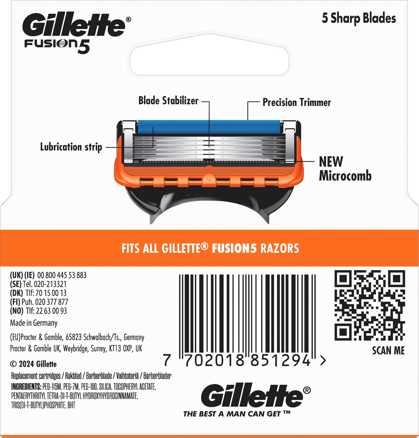 Gillette Fusion5 -vaihtoterillä saat tarkemman ja pidempikestoisen lopputuloksen*. Niissä on 5 kitkaa vähentävää terää tarkkaan ajoon ja Precision-parranrajausterä hankalia alueita varten. Suurempi voitelunauha antaa voitelua terien jälkeen, jotta saat sujuvan ajon*. Oletko huolissasi siitä, että Gillette-varsi ei sovi? Kaikki Fusion5-terät sopivat kaikkiin Gillette Fusion5 -varsiin. Jokaisella vaihtoterällä ajat jopa kuukauden, minkä ansiosta voit mukauttaa parranajoa ja ottaa kaiken irti jokaisesta terästä. (*verrattuna Mach3 -teriin)