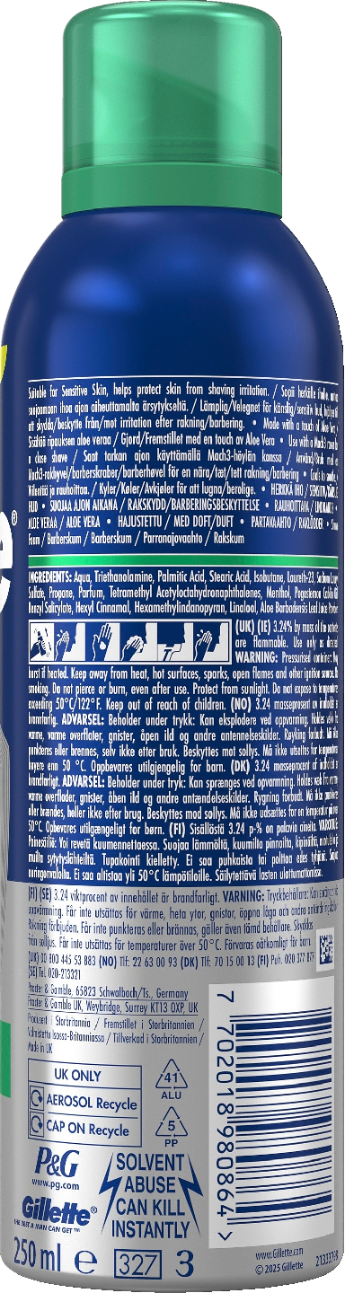 Gillette Sensitive -parranajovaahto kohtelee herkkää ihoa hellävaraisesti. Aloeta sisältävällä koostumuksella on kolminkertainen vaikutus: se rauhoittaa ihoa ja tekee ajosta viilentävän ja miellyttävän, se kosteuttaa ajon aikana ja se auttaa suojaamaan ihoärsytykseltä. Tuloksena on tarkka ajo ja sileä iho.