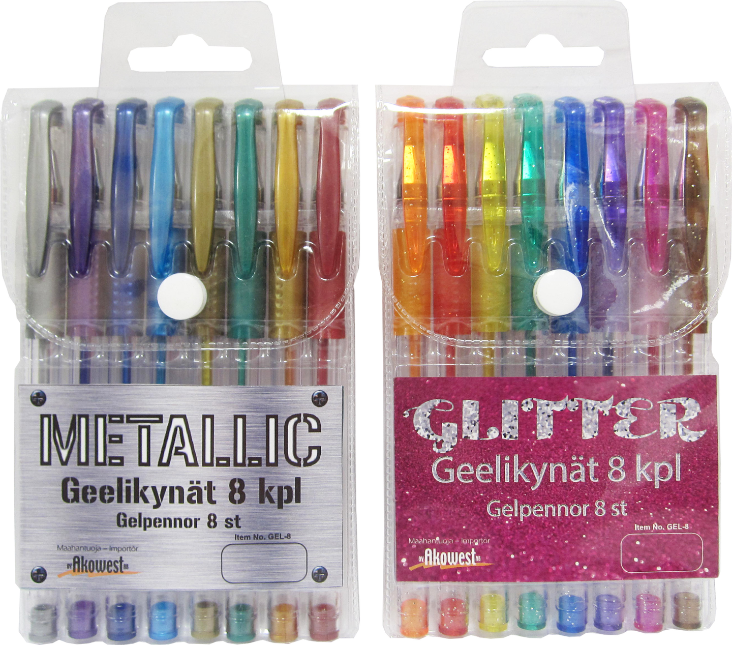 Geelikynät 8 kappaleen paketissa. Vaihtoehtoina Glitter tai Metallic.