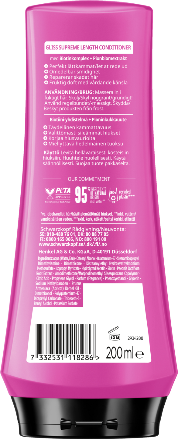 Pettynyt pitkiin, elottomiin ja vaurioituneisiin hiuksiin, jotka sinun on leikattava kuukausittain? Gliss Supreme Length hoitoaine sisältää biotiinia ja pionin kukkaa, jotka korjaavat vaurioituneita hiuksiasi ja lisäävät pitkiin hiuksiisi eloisuutta. Hoitoaine tekee hiukset välittömästi pehmeiksi ja sileiksi. Supreme Length tuotelinjan tuotteet ovat Gliss hoitoasteikon ensimmäisen tason tuotteita, ja ne sopivat erityisesti normaaleille, mutta hennoille ja hieman kuiville hiuksille. Tuotteet takaavat hellävaraista hoitoa ilman latistavaa tunnetta. 95 % luonnollista alkuperää olevia aineosia*. Schwarzkopf GLISS takaa 100 % vahvemmat hiukset.** Tuote on PETA-sertifioitu. Schwarzkopf GLISS pakkaukset jopa 100 % kierrätettyä muovia. *Sisältäen veden. ** vs. käsittelemättömät hiukset