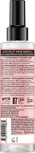 Oletko kyllästynyt katkenneisiin latvoihin ja jatkuvasti leikkaamaan kaksihaaraisia hiuksiasi? Gliss Split Hair Miracle -tuotesarja on kaksihaaraisille ja vaurioituneille hiuksille suunniteltu sarja korkeimmalla hoitoasteella. Split Hair Miracle hoitosuihke hoitaa hiuksia ja selvittää takkuja intensiivisesti, ravitsee sekä pehmentää hiuksia sekä korjaa vaurioituneita hiuskuituja. Hoitosuihke yhdistää kaksihaaraisten hiusten haaroittuvat osat pitkäkestoisesti. Hoitosuihkeen lämpösuoja suojaa lämpökäsittelyn aiheuttamia vahinkoja vastaan. IONIYHDISTETTÄ JA VIINIRYPÄLEEN SIEMENÖLJYÄ sisältävä linja poistaa rakenteellisia eroavaisuuksia juurista latvoihin, jonka avulla saavutat vahvat ja terveennäköiset hiukset! Schwarzkopf GLISS takaa 100 % vahvemmat hiukset.* Tuote on PETA-sertifioitu ja jopa 87 % ainesosista on luonnollista alkuperää.**. Schwarzkopf GLISS pakkaukset jopa 100 % kierrätettyä muovia. * vs. käsittelemättömät hiukset **Sisältäen veden